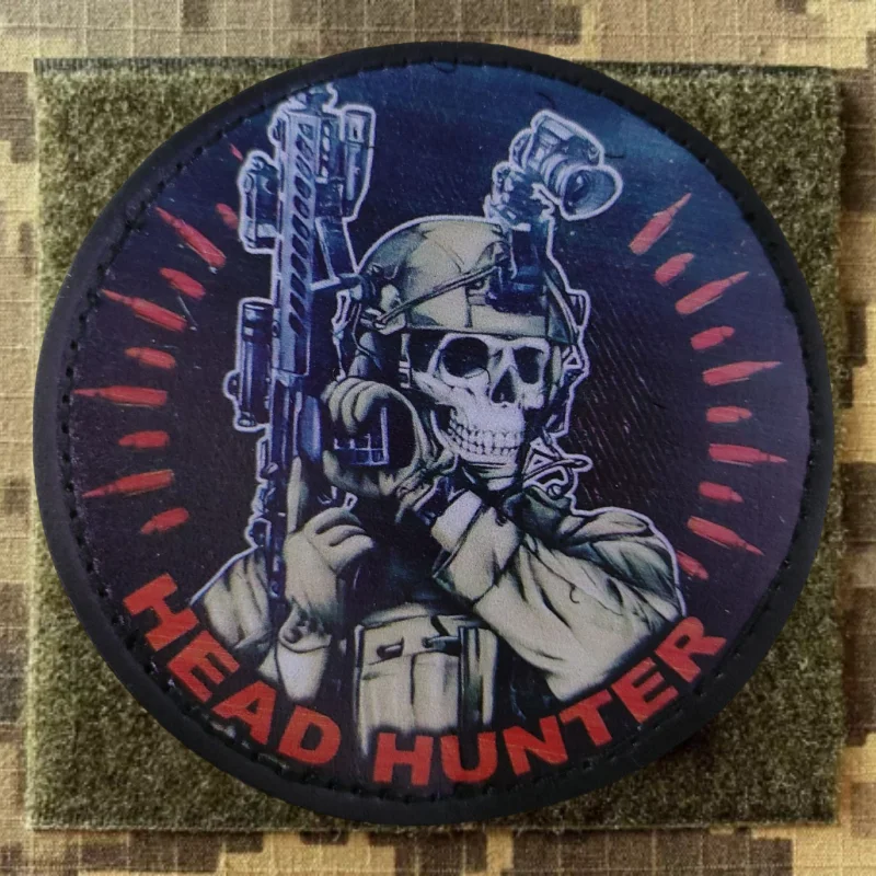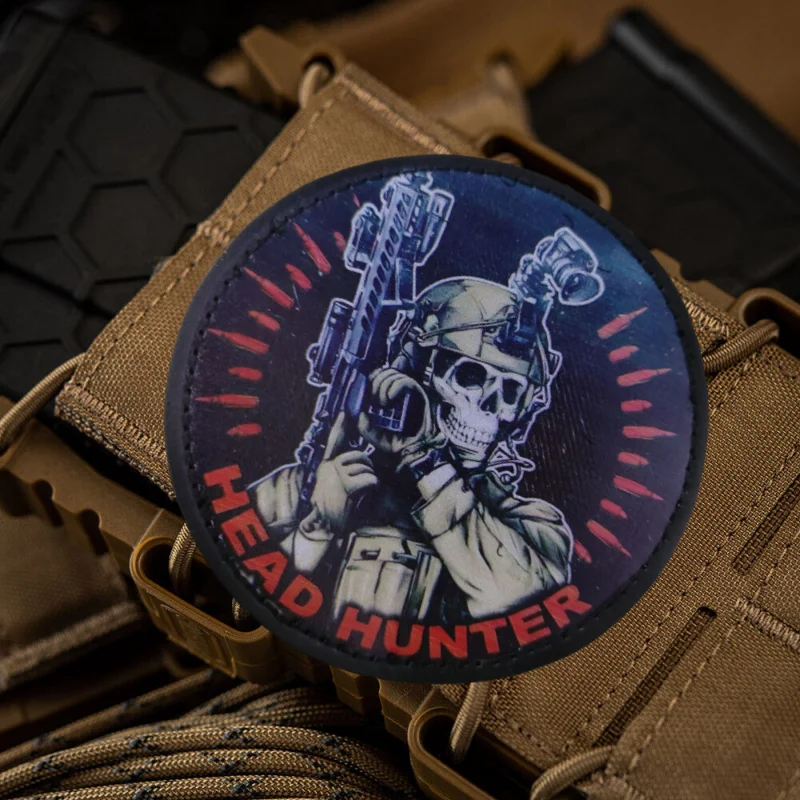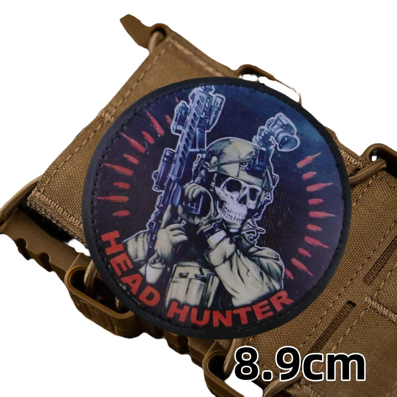 Insignia táctica de cazador de cabeza, Parche de gancho y bucle impreso de PU, esqueleto militar, soldado con pistola, brazalete de moral, mochila, pegatina de ropa