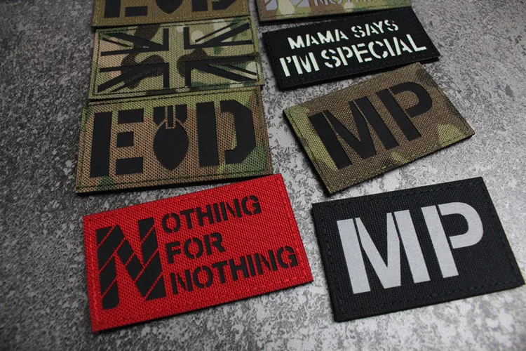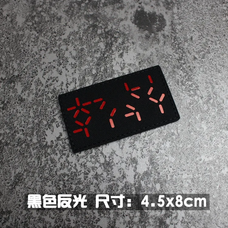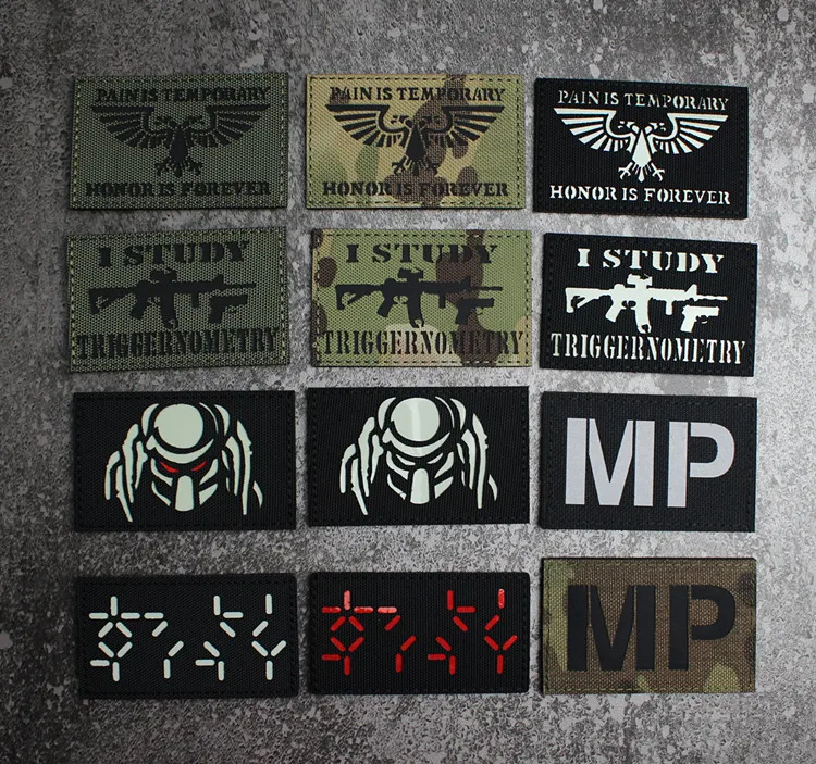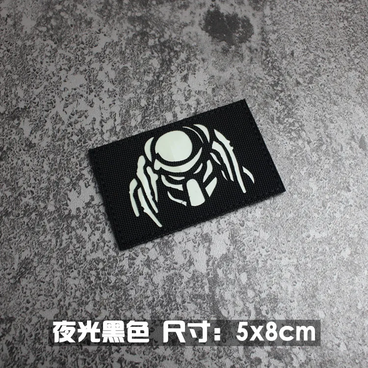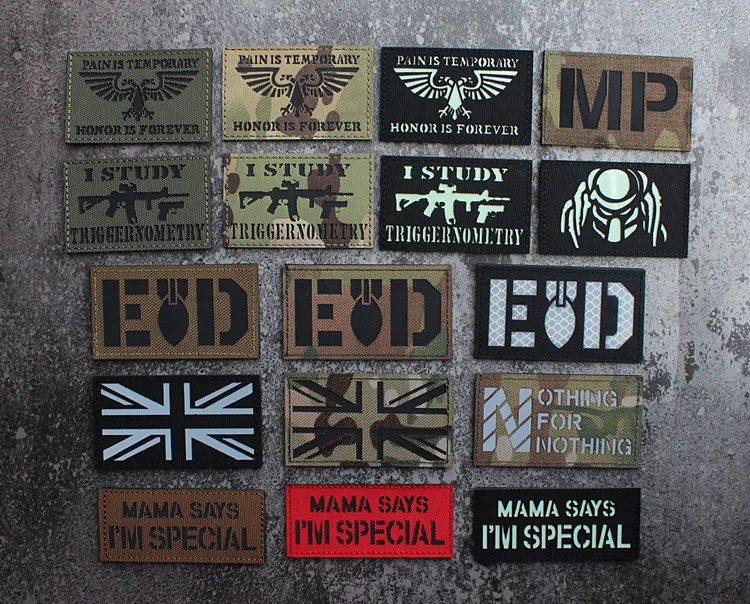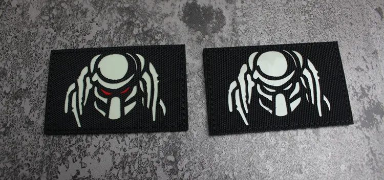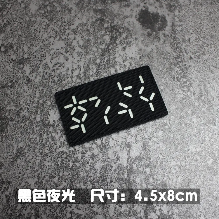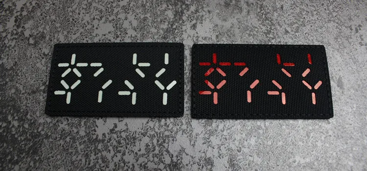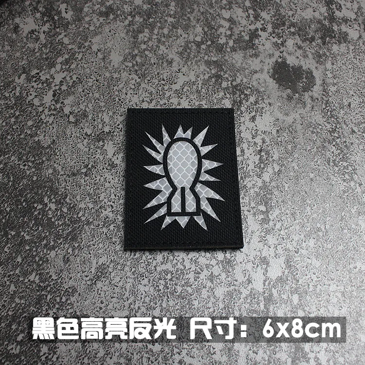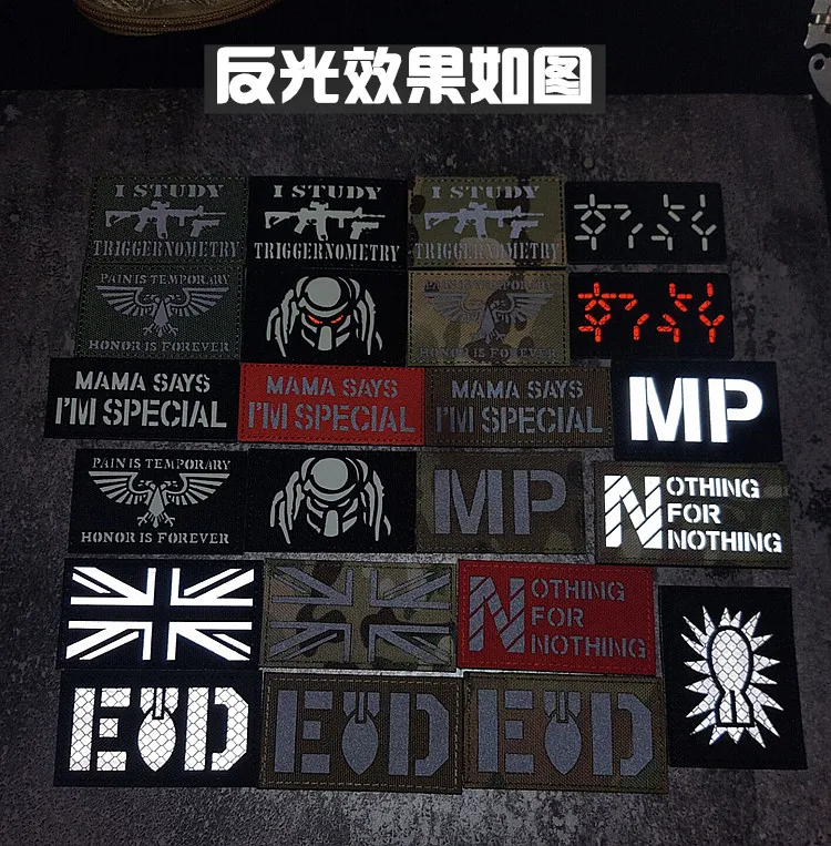 Nota: La placa base blanca es un material absorbente de luz y tiene un efecto fluorescente verde cuando se ilumina. La tela de base de nailon importada, las insignias grabadas con láser y la luz directa tienen un efecto reflectante.