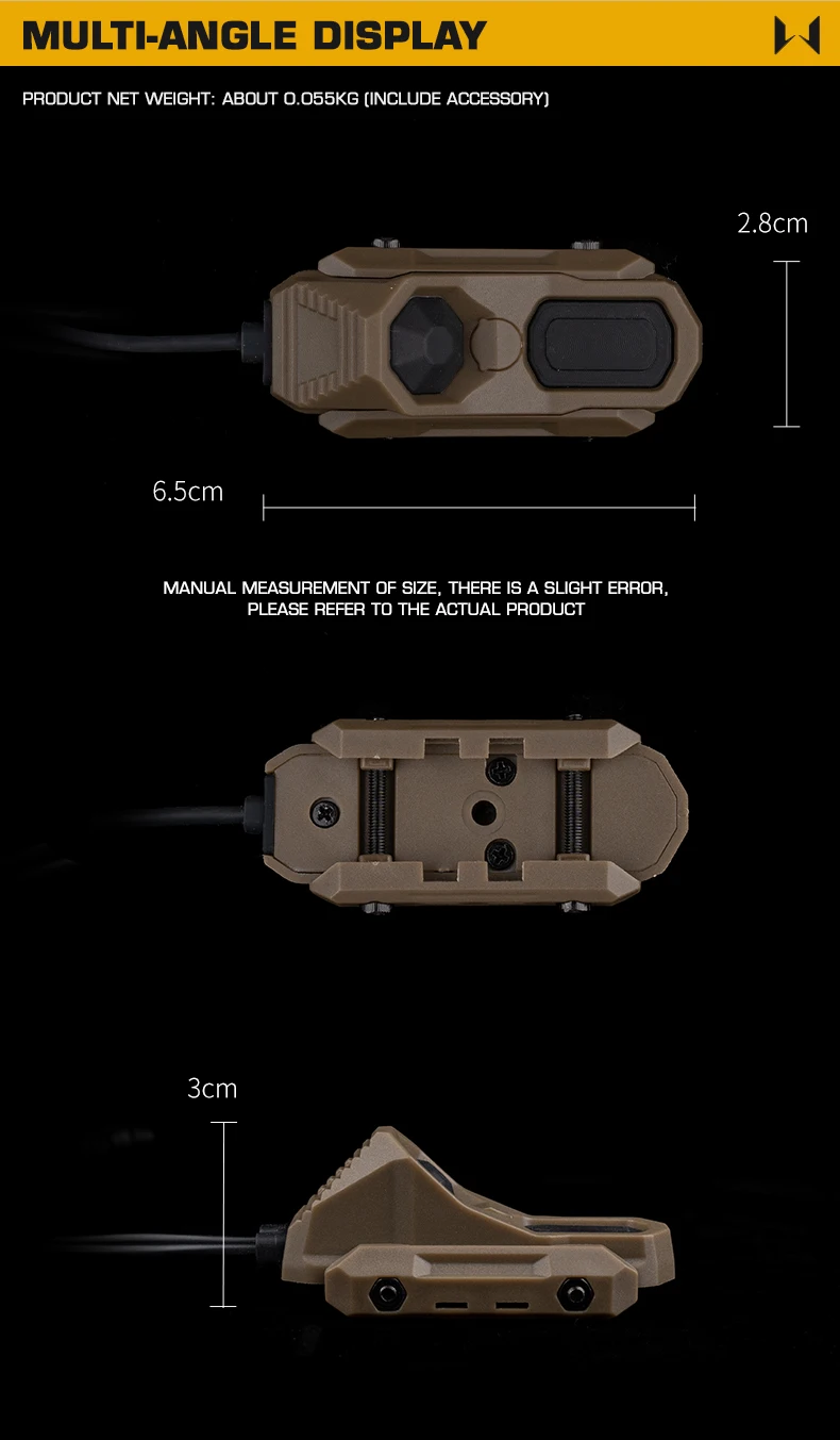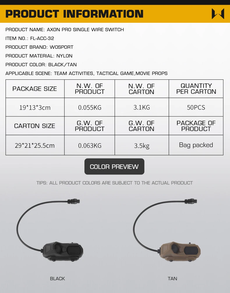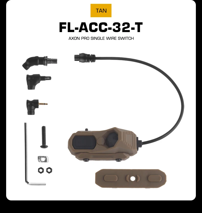 Información del producto Nombre del producto: interruptor de un solo cable AXON Pro Material del producto: nailon Color del producto: negro/tan Escena aplicable: actividades de equipos, juegos de caza, accesorios de películas.
