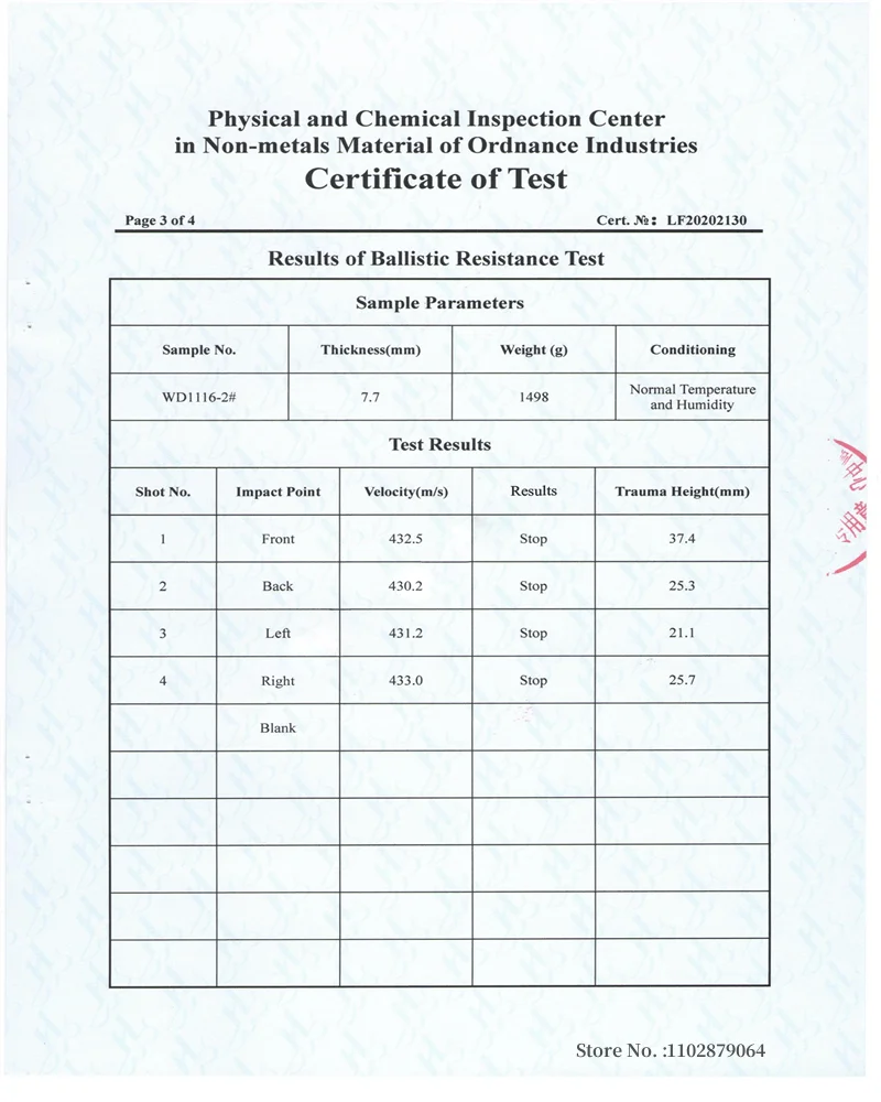 Carcasa de la misma calidad: totalmente compatible con NIJ IIIA 0106.01 y el protocolo de trauma US D.O.D de 9 mm, que es idéntico.Puede reconocer que nuestro trauma es menor que la mayoría de los productos de nuestros competidores en China**