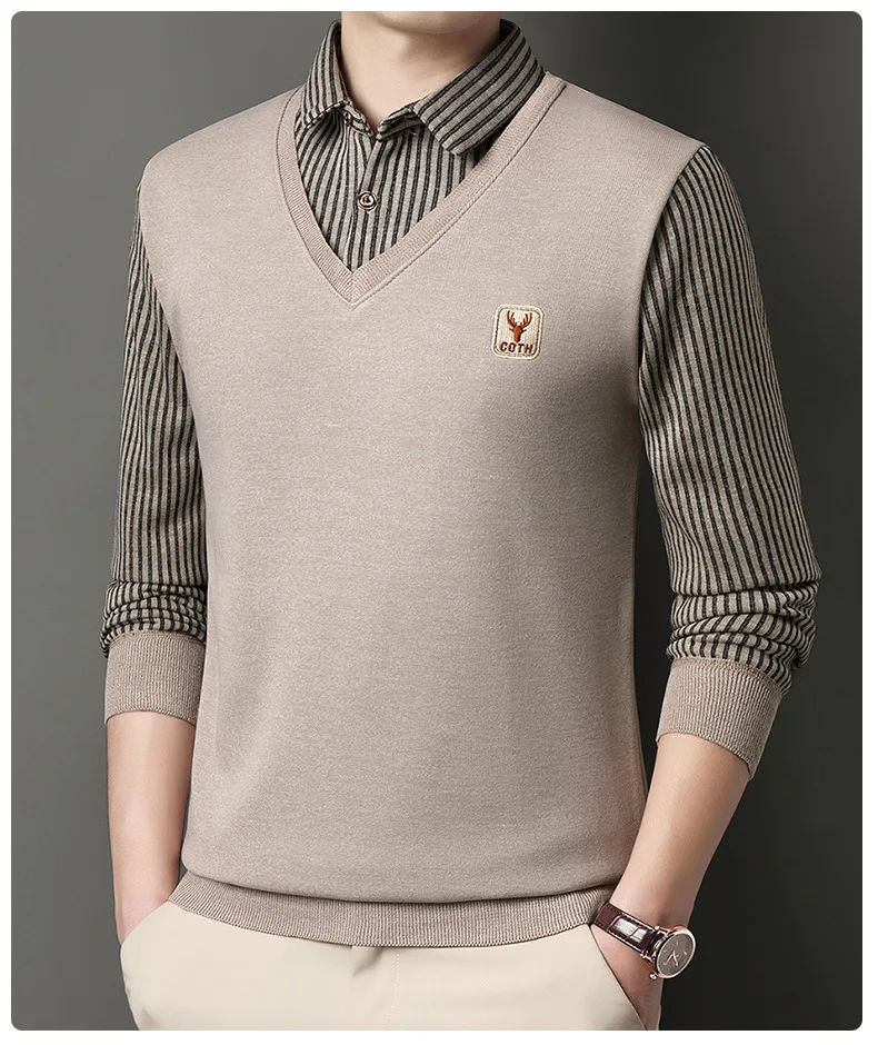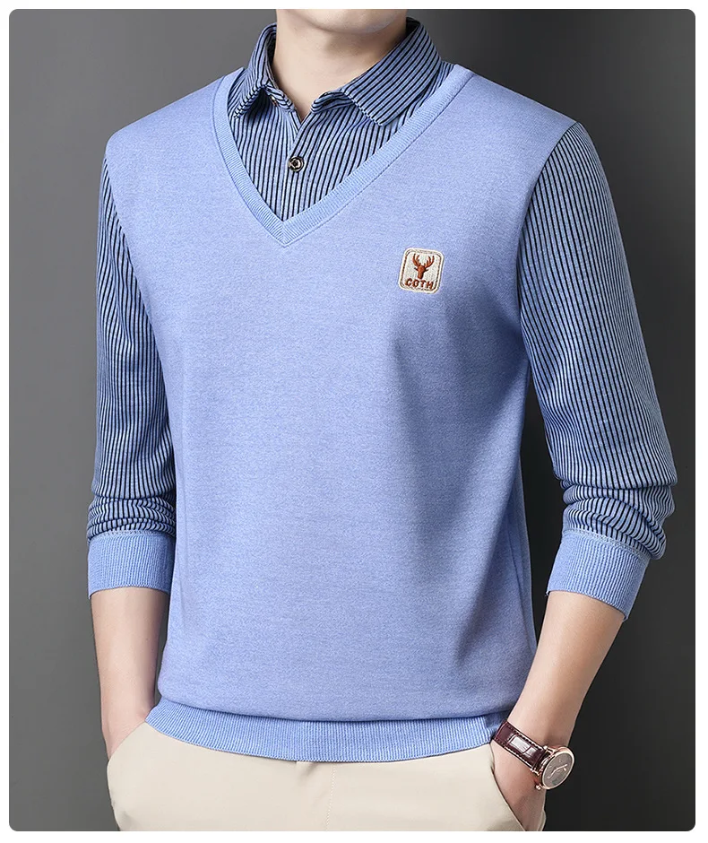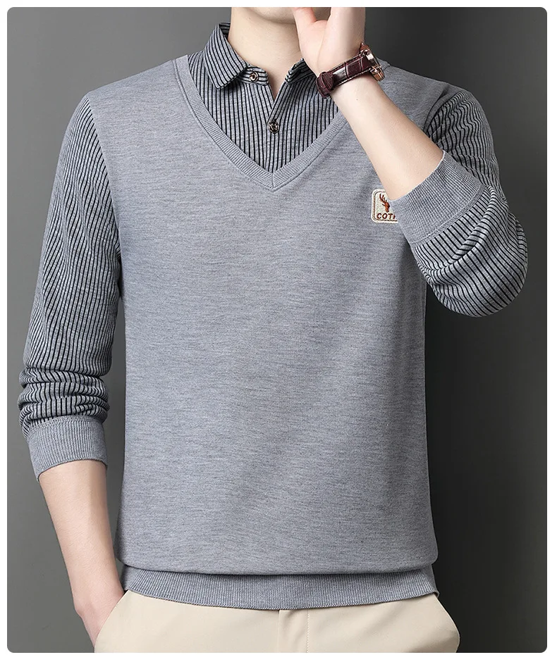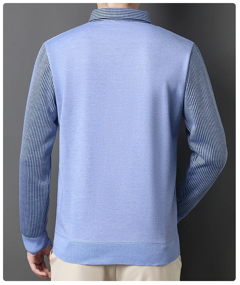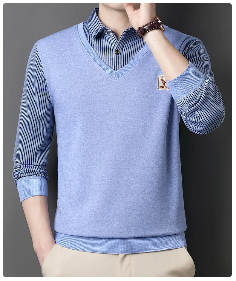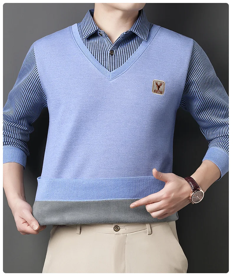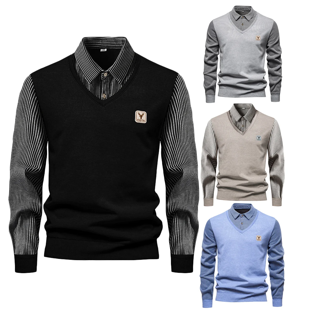 Jersey de punto de lana para hombre, suéter de negocios para trabajo de otoño e invierno, 2 uds., camisa falsa a rayas de dos piezas, suéter grueso y cálido ajustado