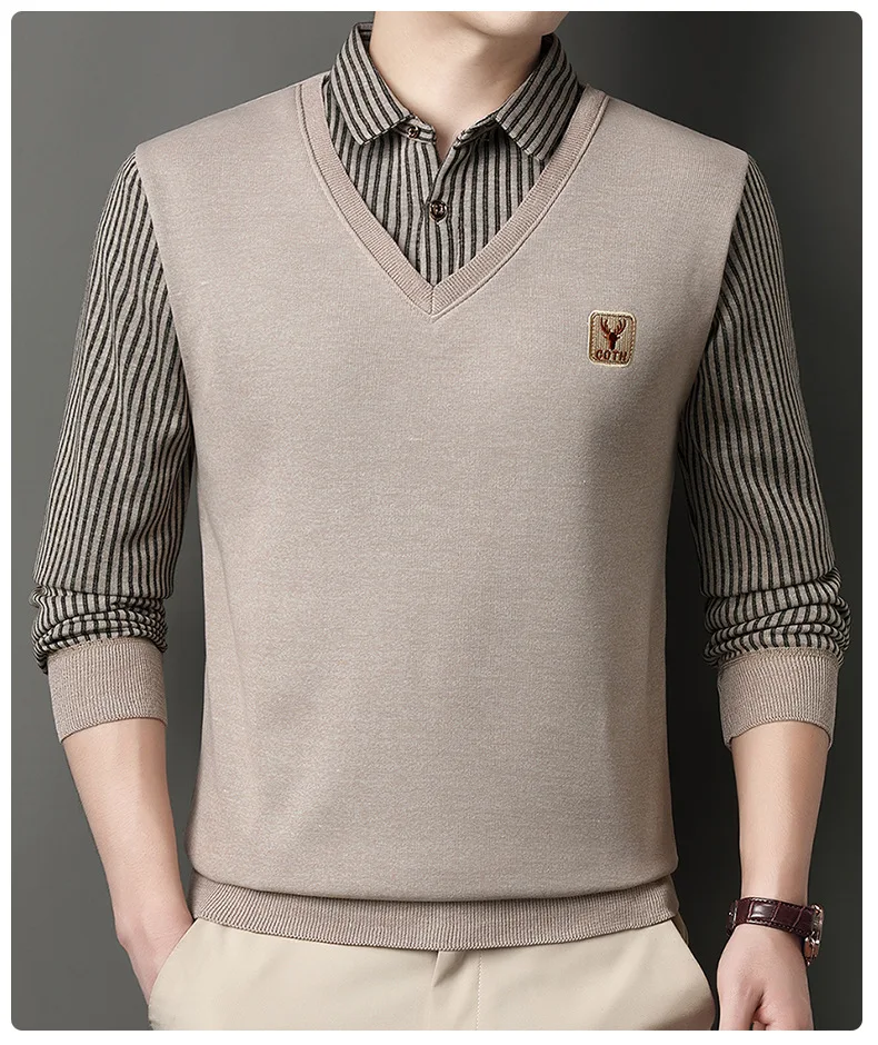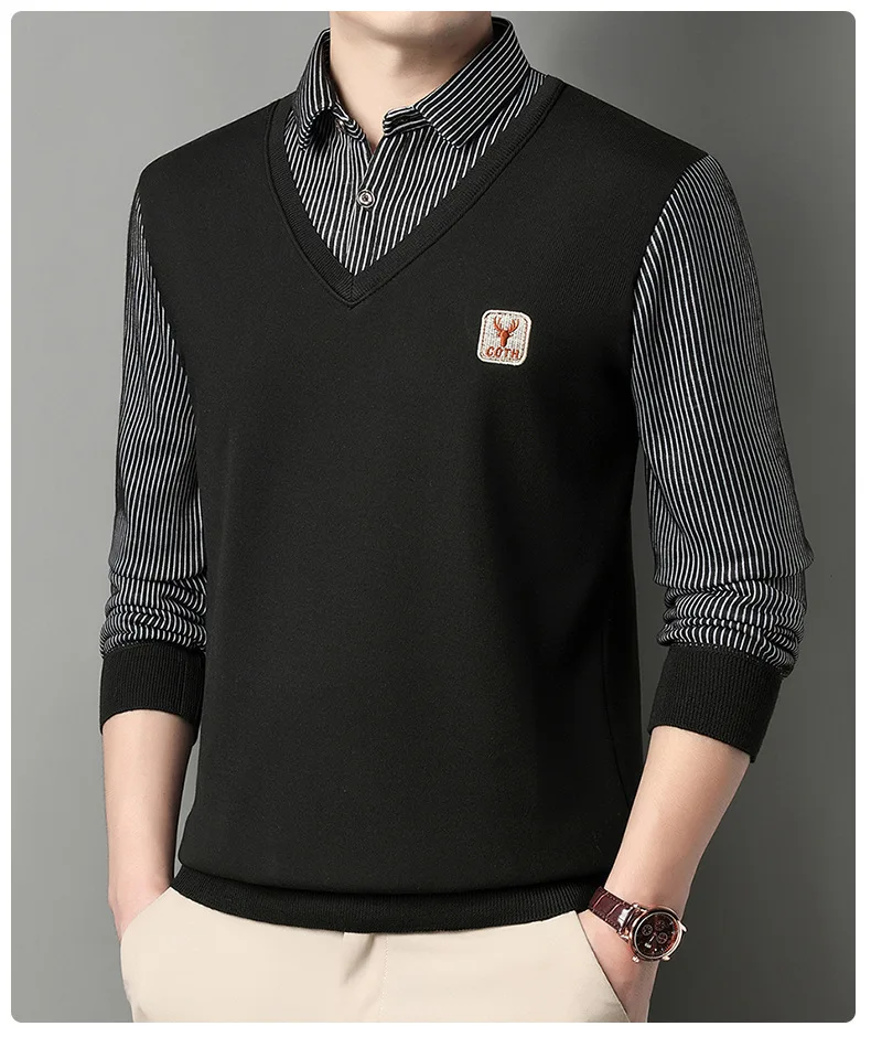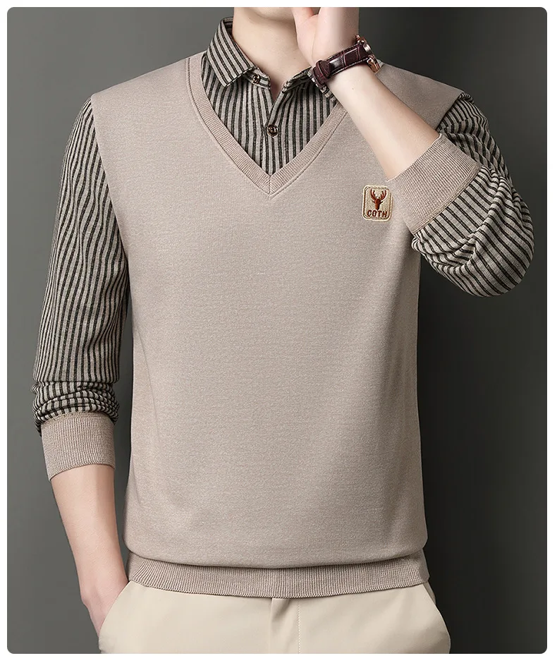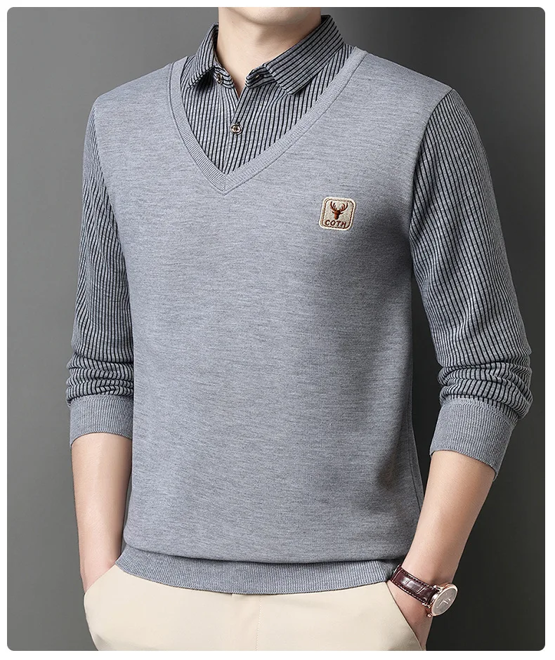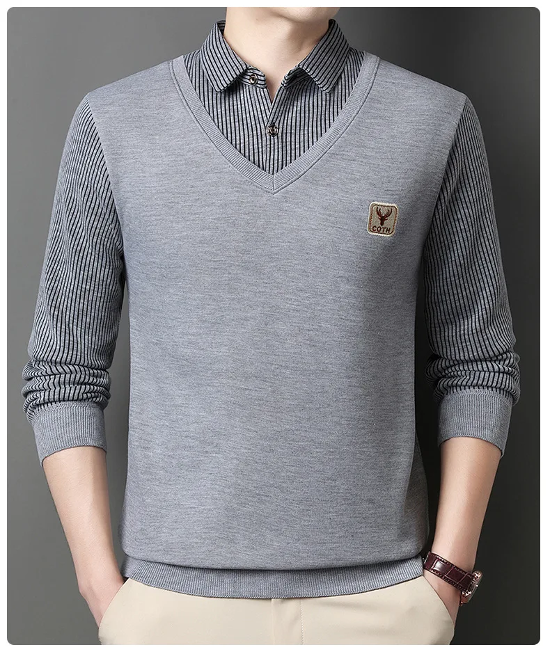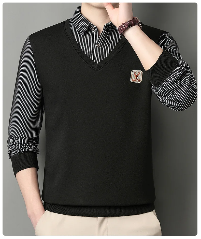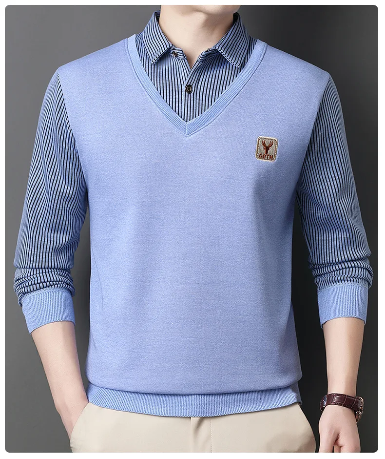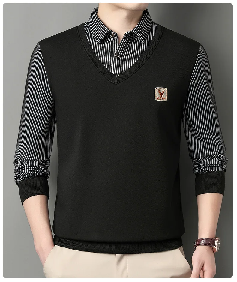 Jersey de punto de lana para hombre, suéter de negocios para trabajo de otoño e invierno, 2 uds., camisa falsa a rayas de dos piezas, suéter grueso y cálido ajustado