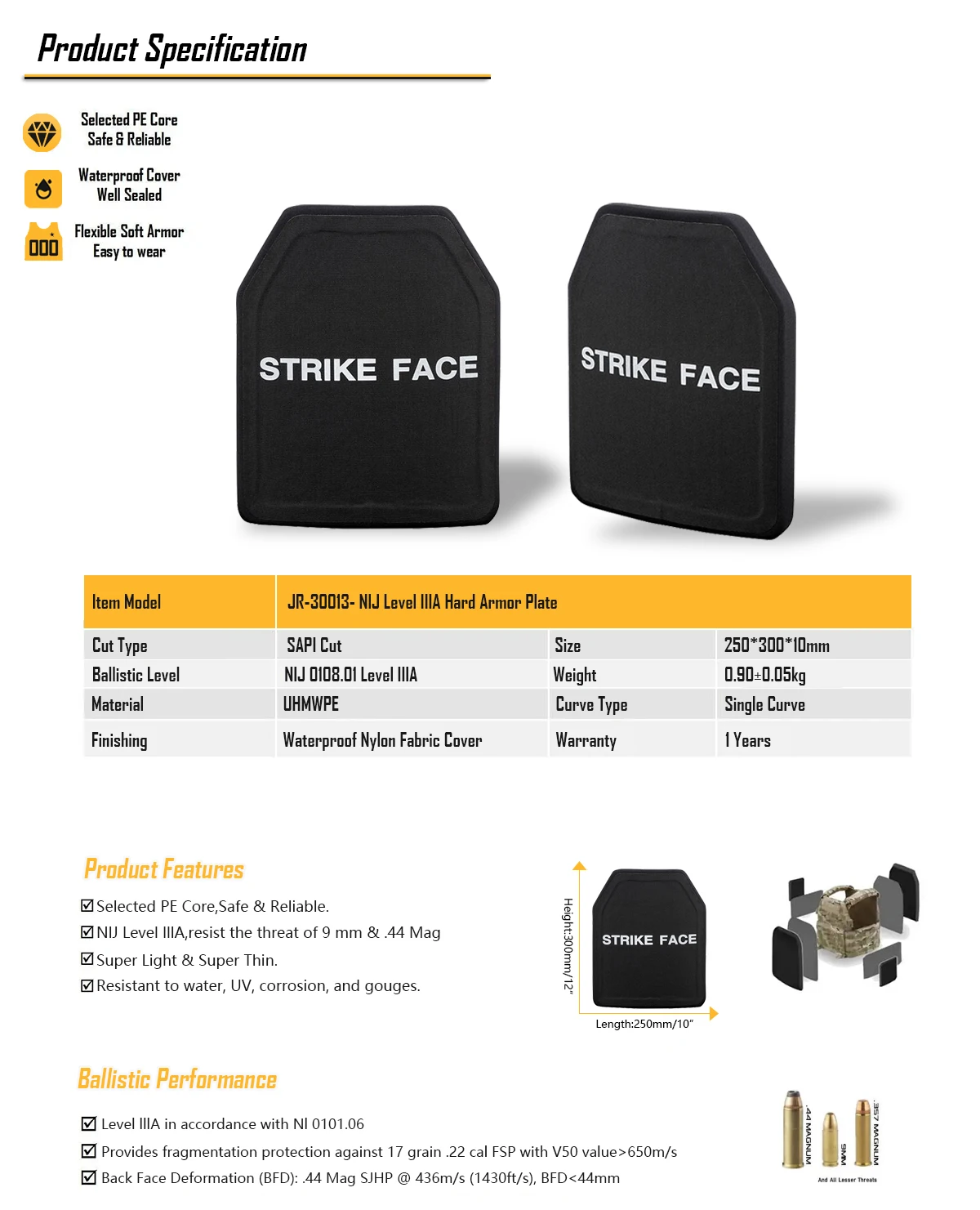 PlateStandard: NIJ 0108,01 IIIA, .44 Mag y 9mm FMJ y. 357 SIG