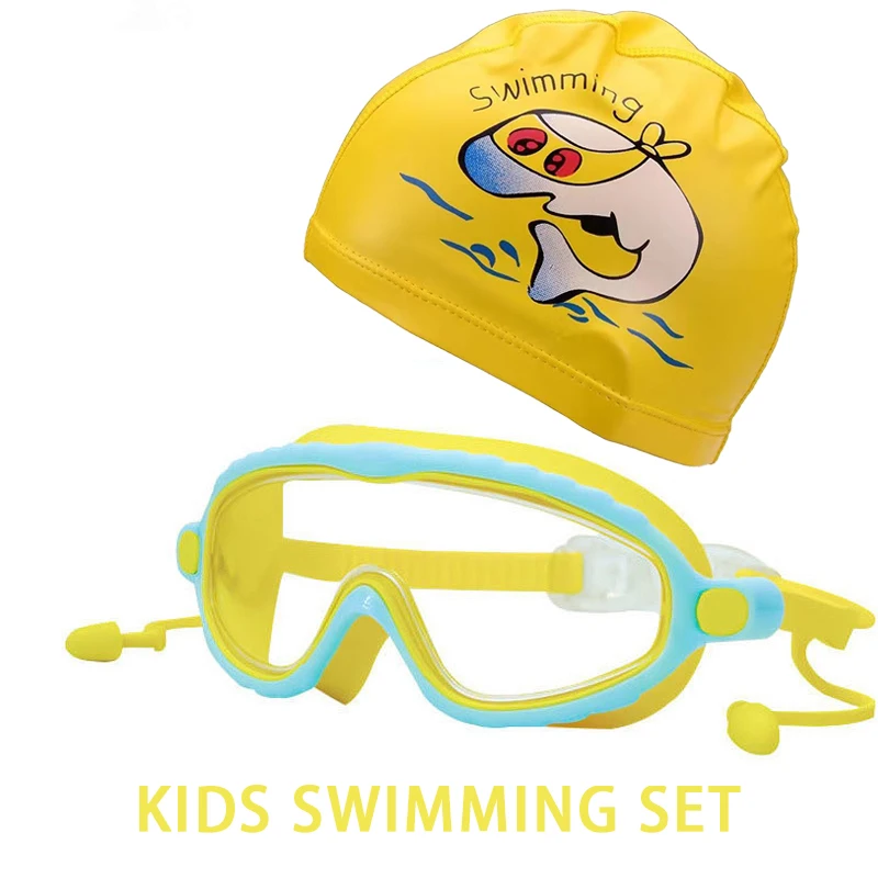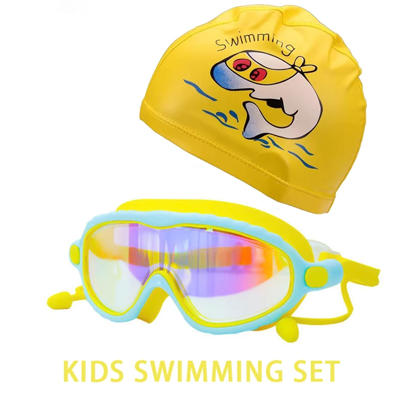 JSJM Juego de gafas de natación para niños y niñas de 3 a 15 años con marco grande y vista HD, gafas de natación de silicona antivaho con gorro de natación de PU