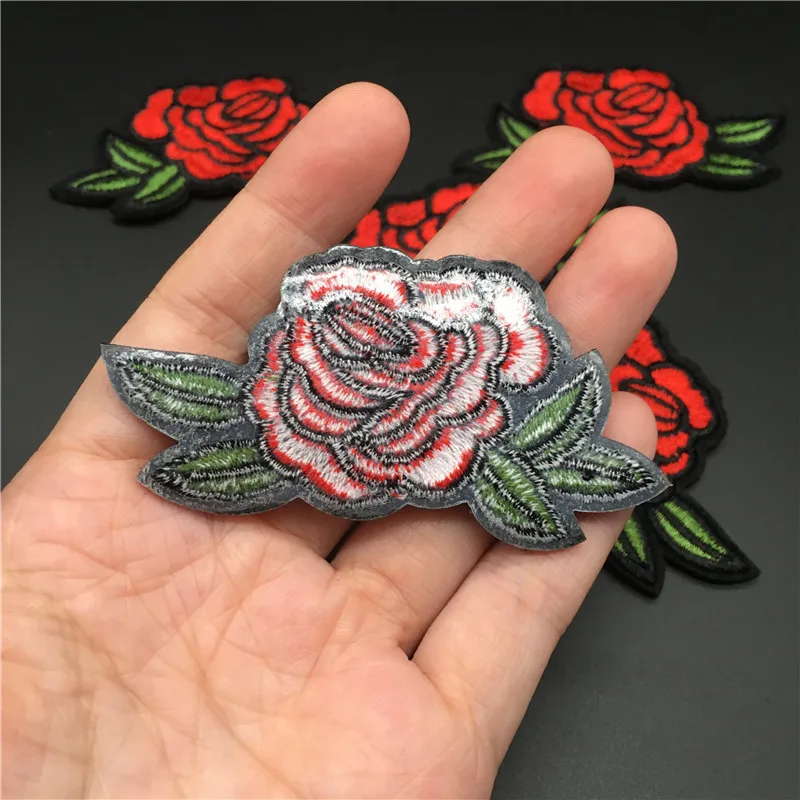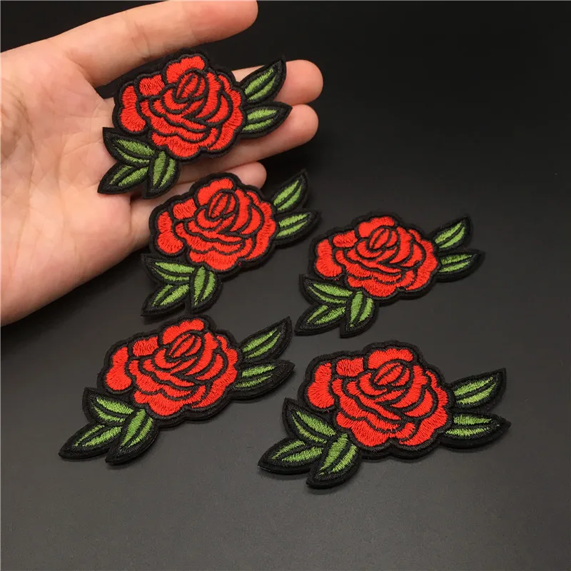 Juego de 5 unids/set de flores rojas, tamaño: 7,5x3,7 cm, bonito parche bordado, raya de costura Diy para apliques de ropa, pegatina para planchar, insignia