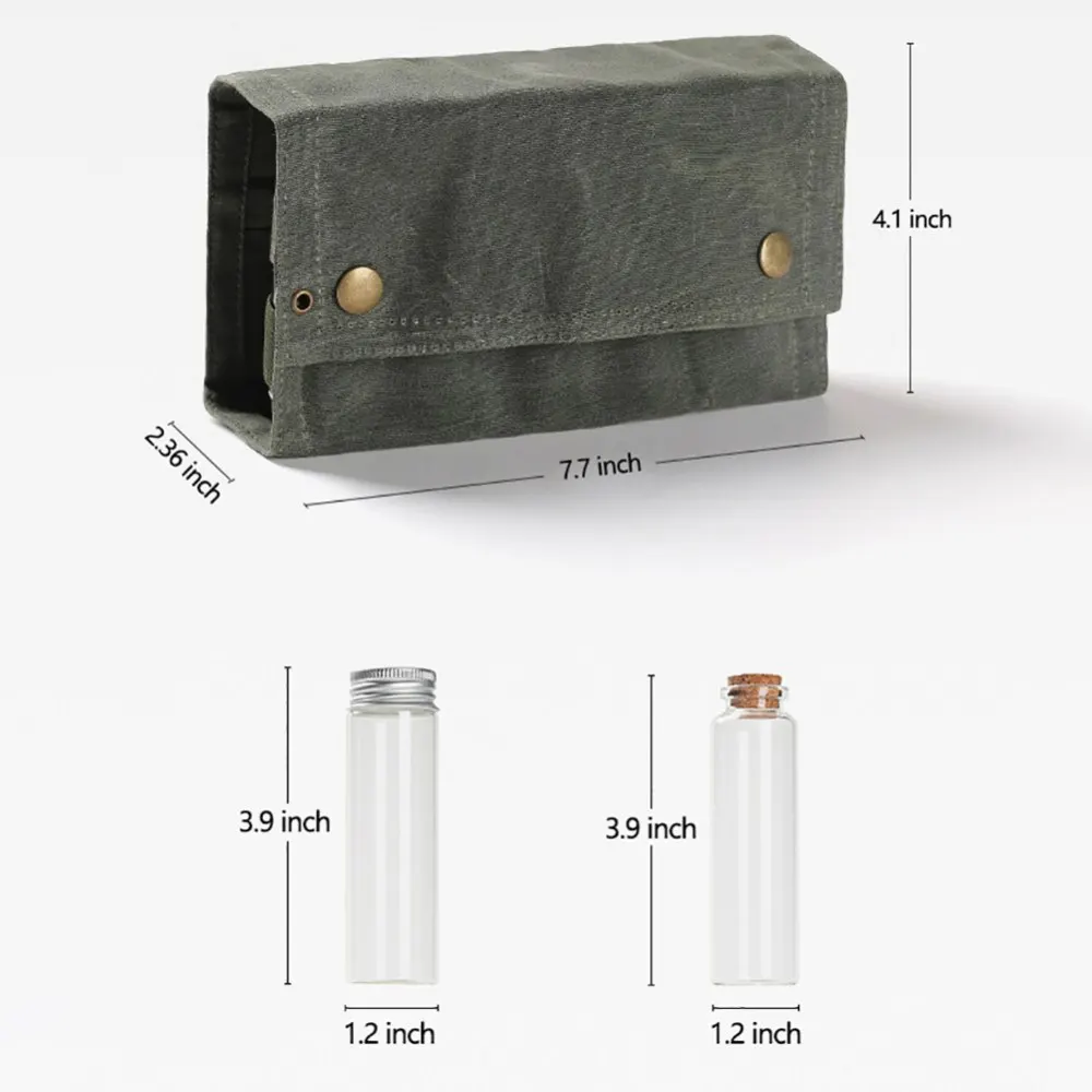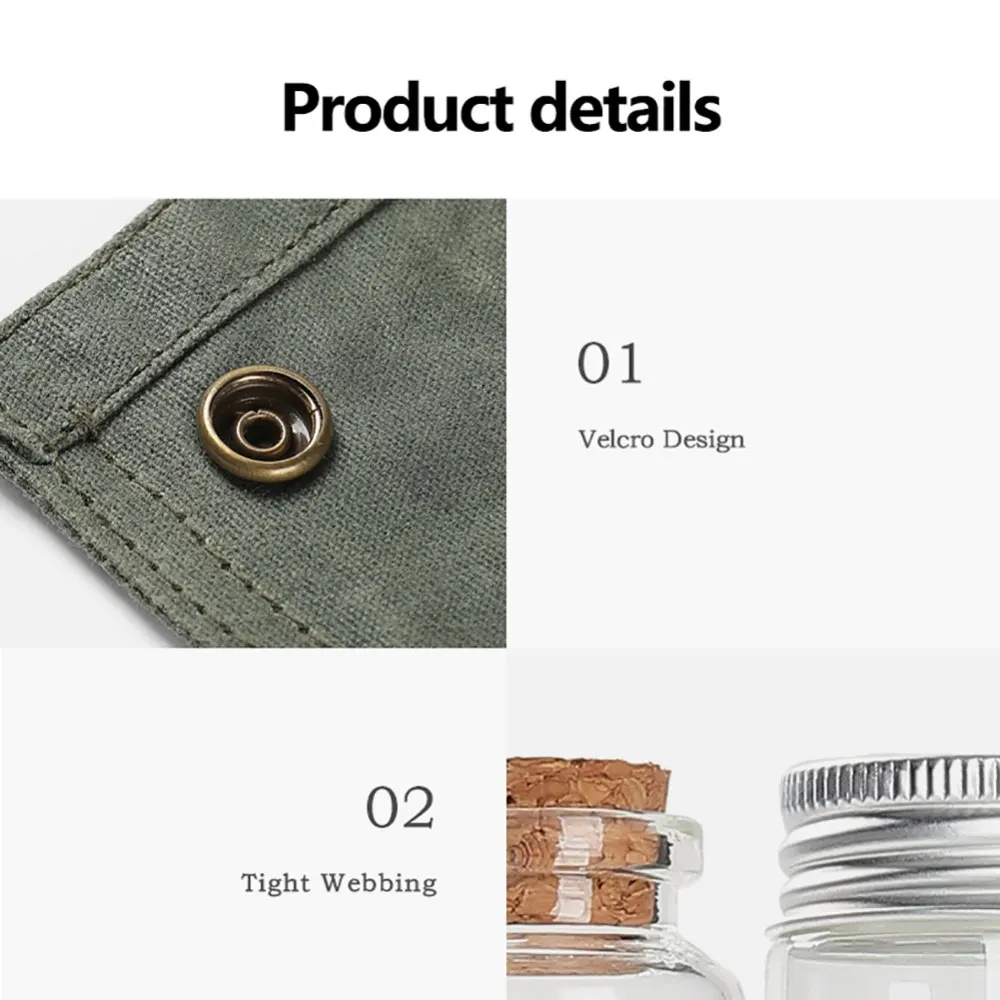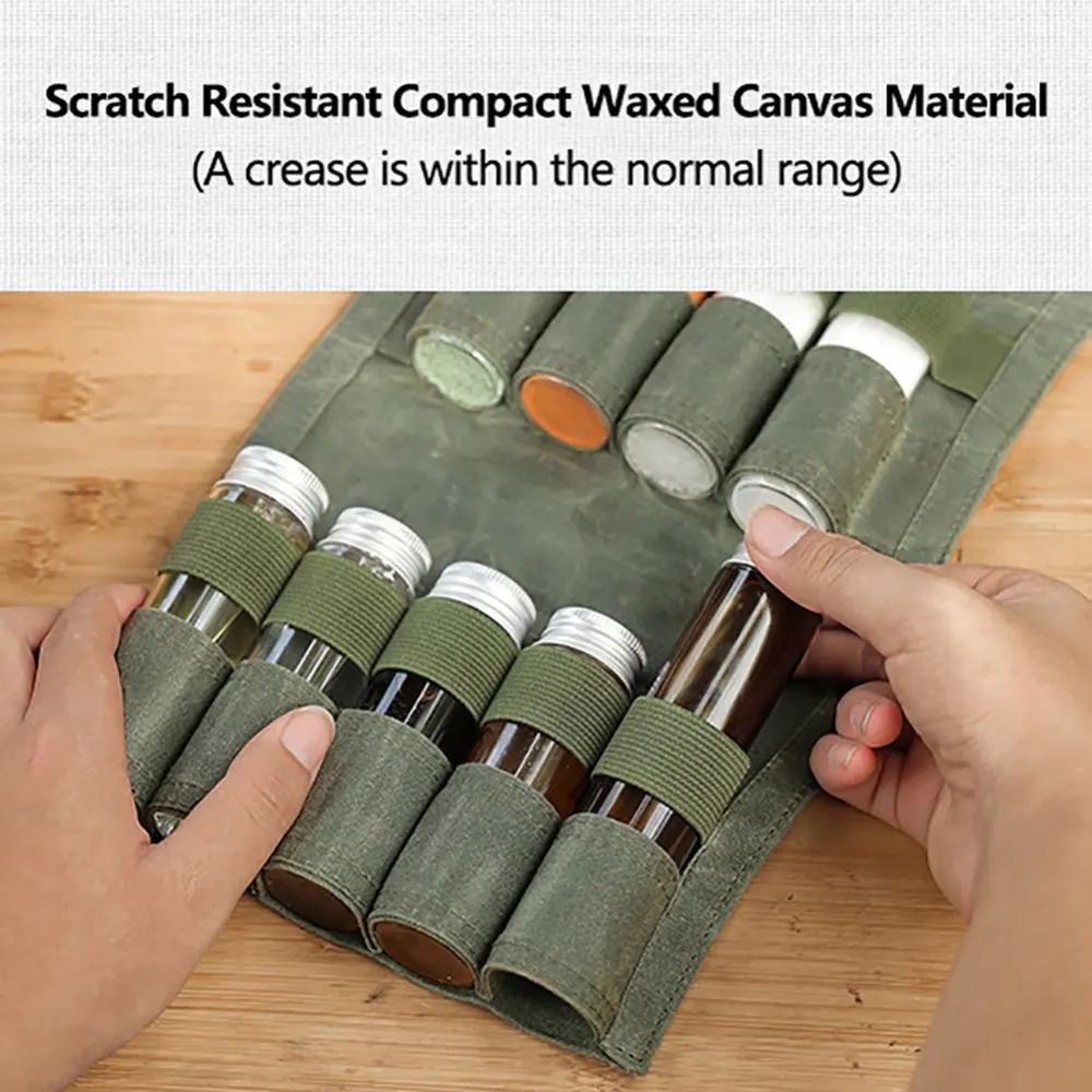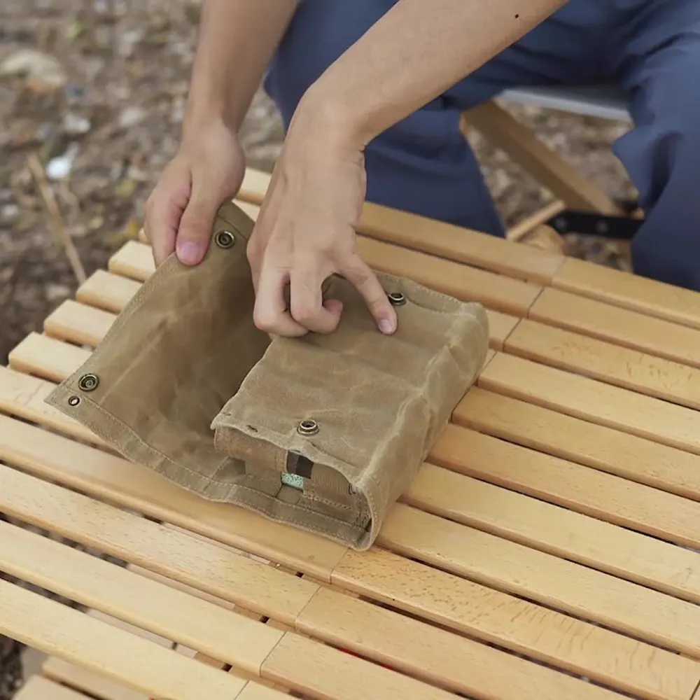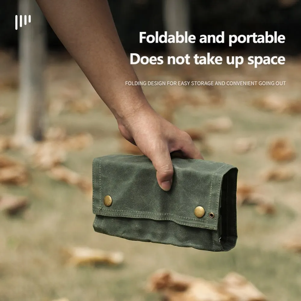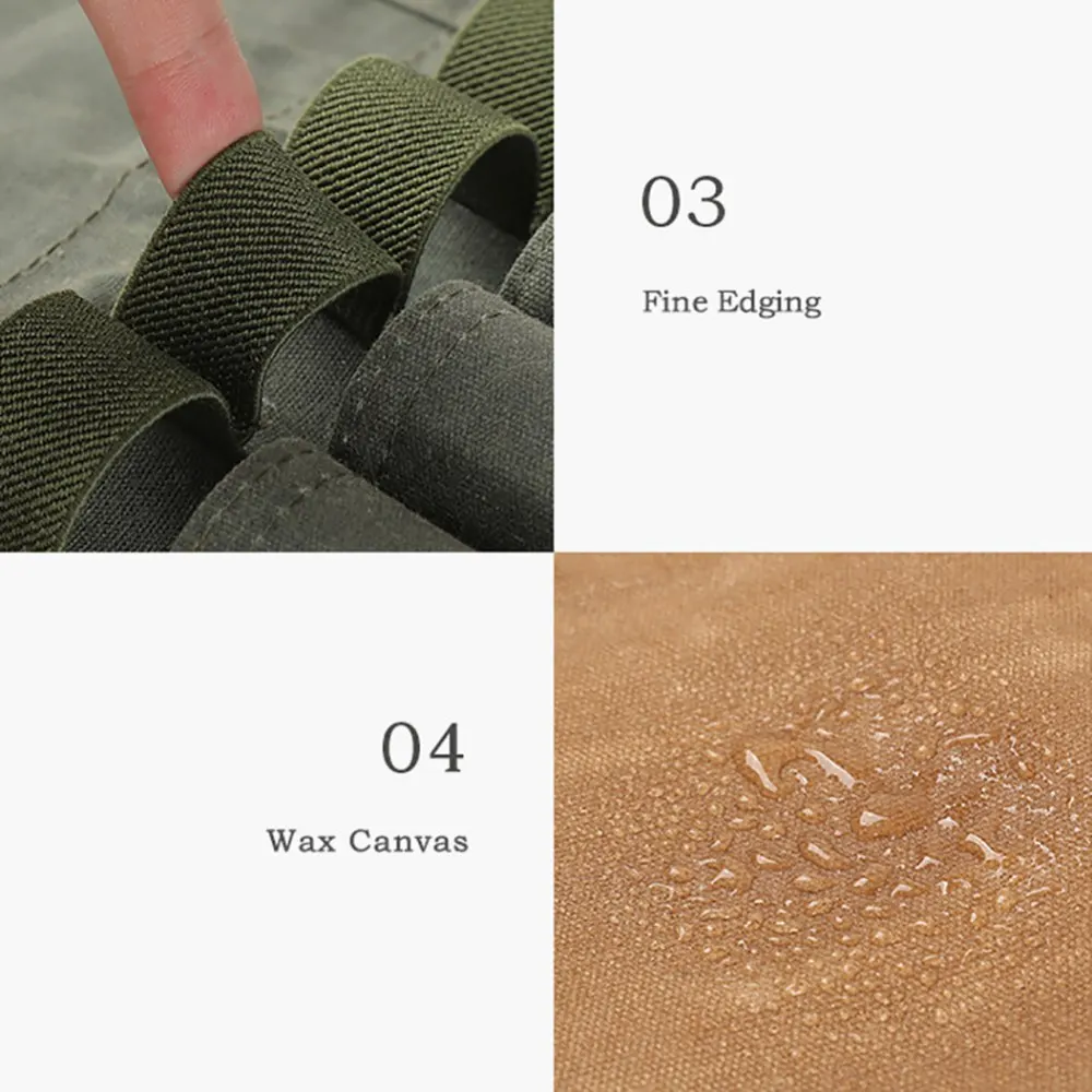 1. Material: está hecho de tela de cera densa resistente a los arañazos de alta calidad. Los agujeros colgantes permiten que esta bolsa de almacenamiento se una fácil y segura a los árboles con paracords.