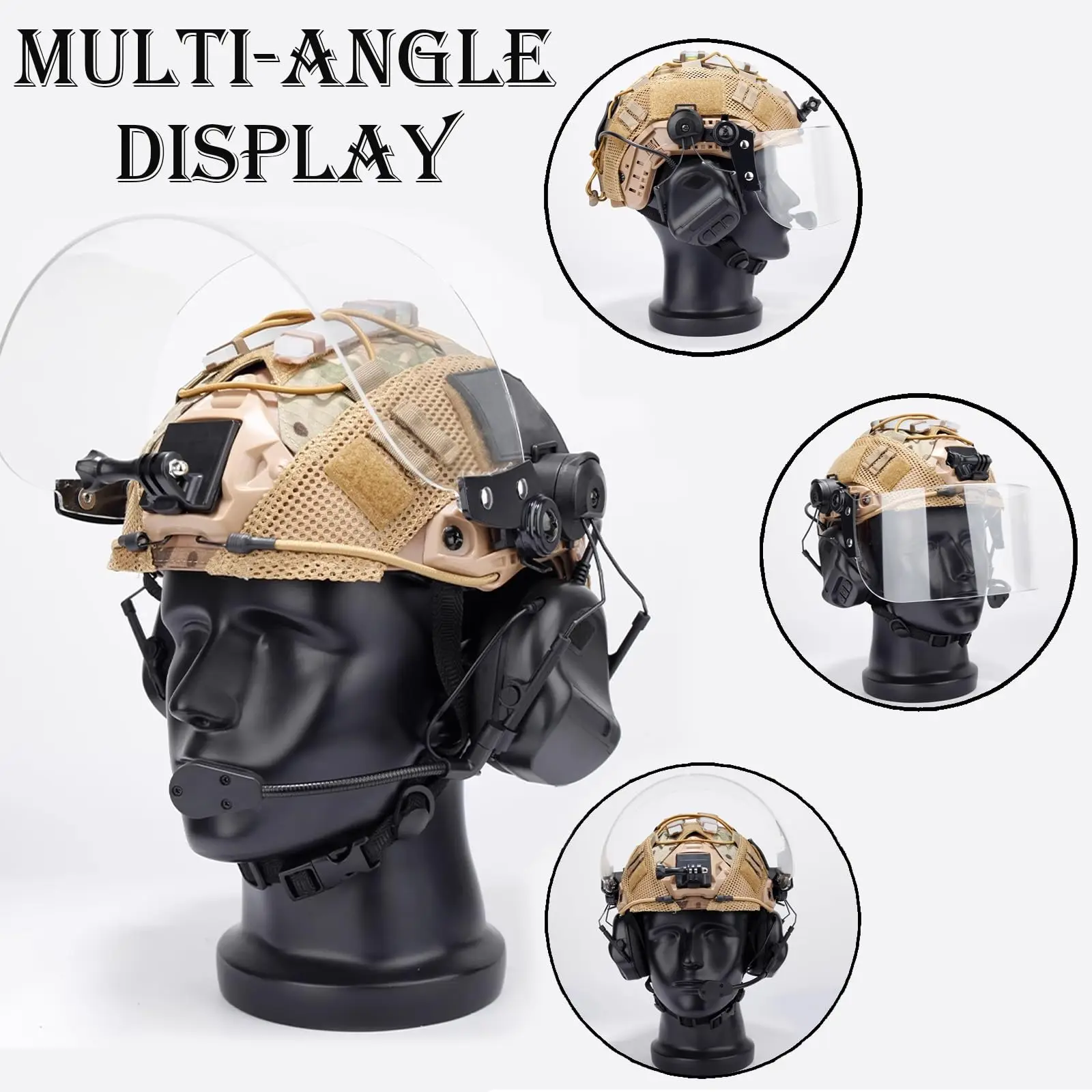 Configuración completa del casco protector: incluye un casco de corte alto, una cubierta de camuflaje, una baliza de señalización, un brazo de montaje de la cámara y una visera antivaho transparente para un uso integral.