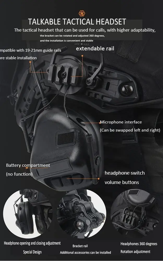 Mejore su audición con los auriculares tácticos que cuentan con un nuevo micrófono omnidireccional y altavoces de alta fidelidad. Son sensibles y le ayudan a reproducir el sonido de manera más clara y precisa.(Sin reducción de ruido, sin PTT)