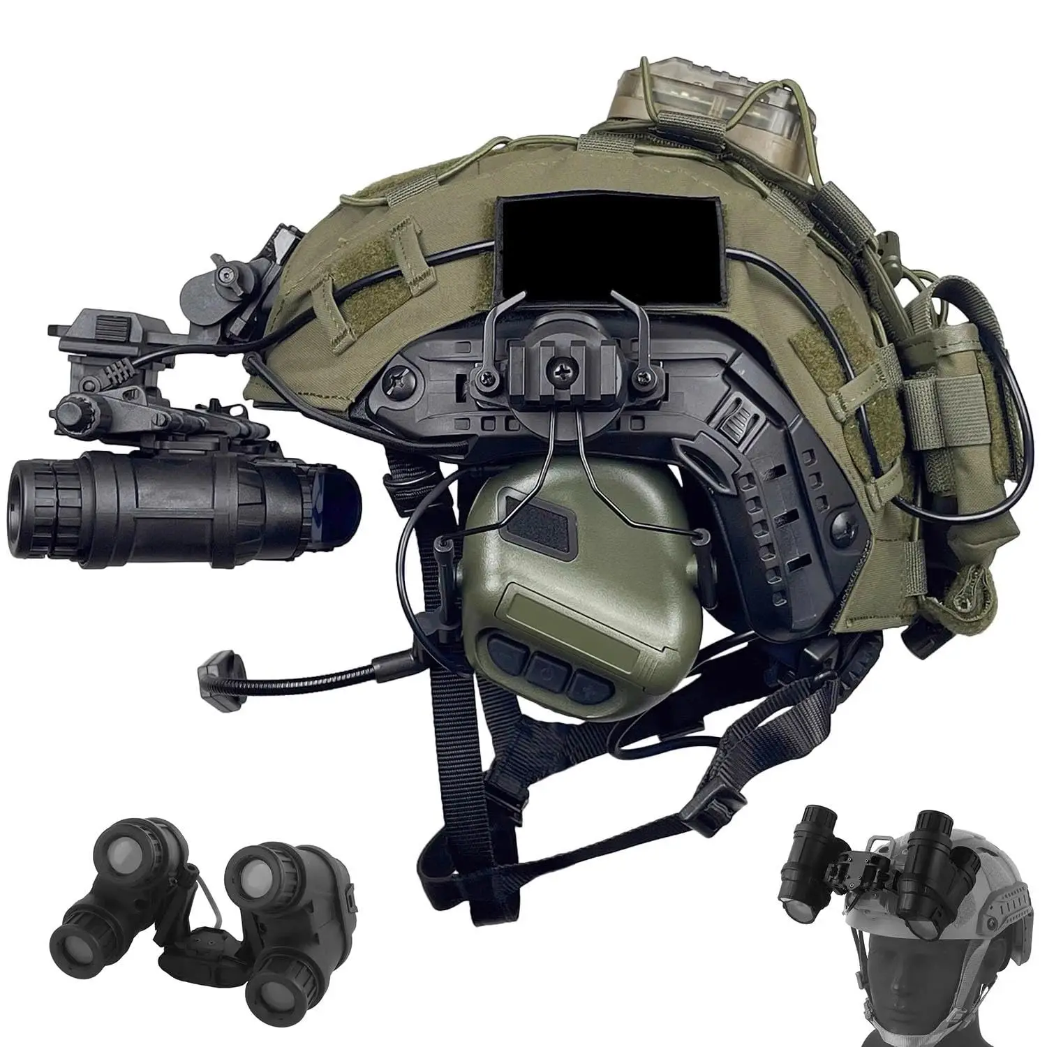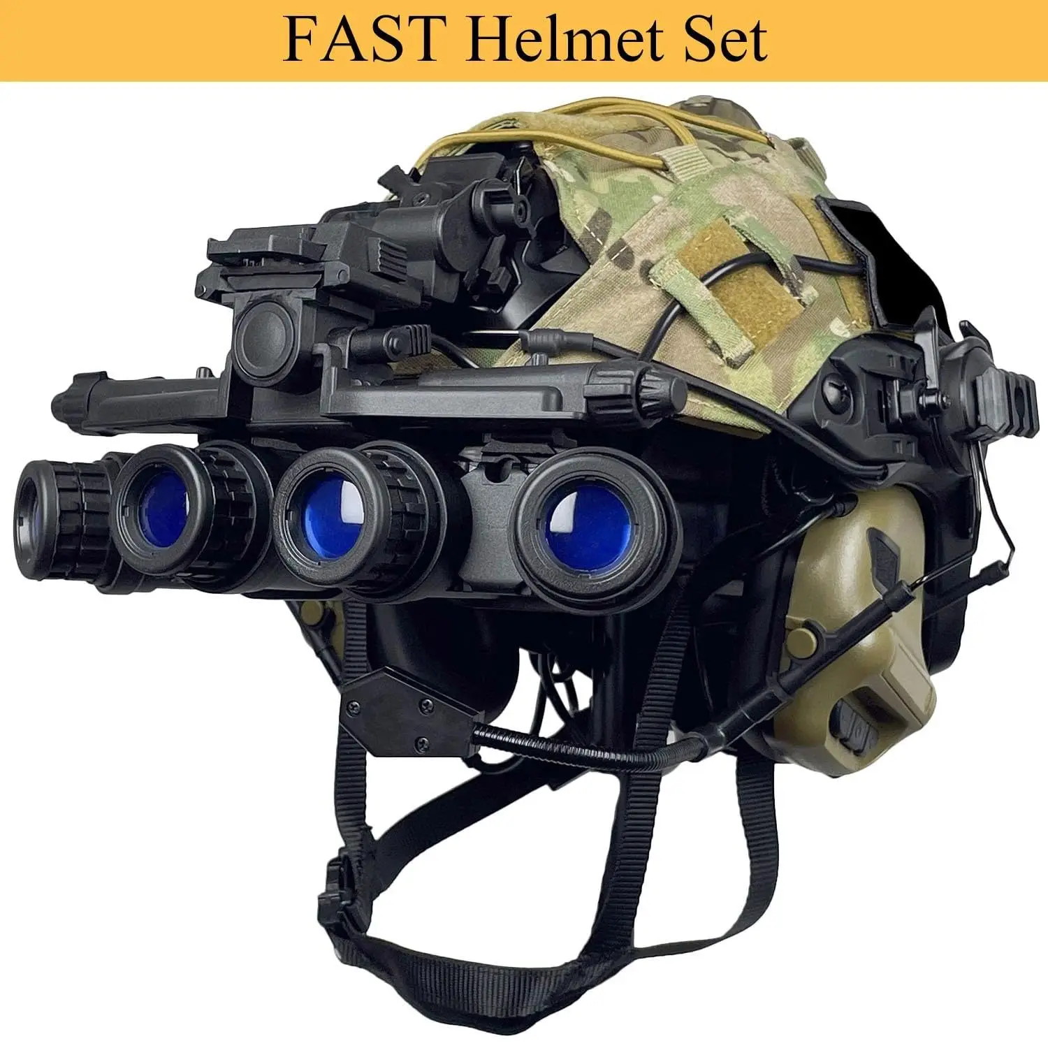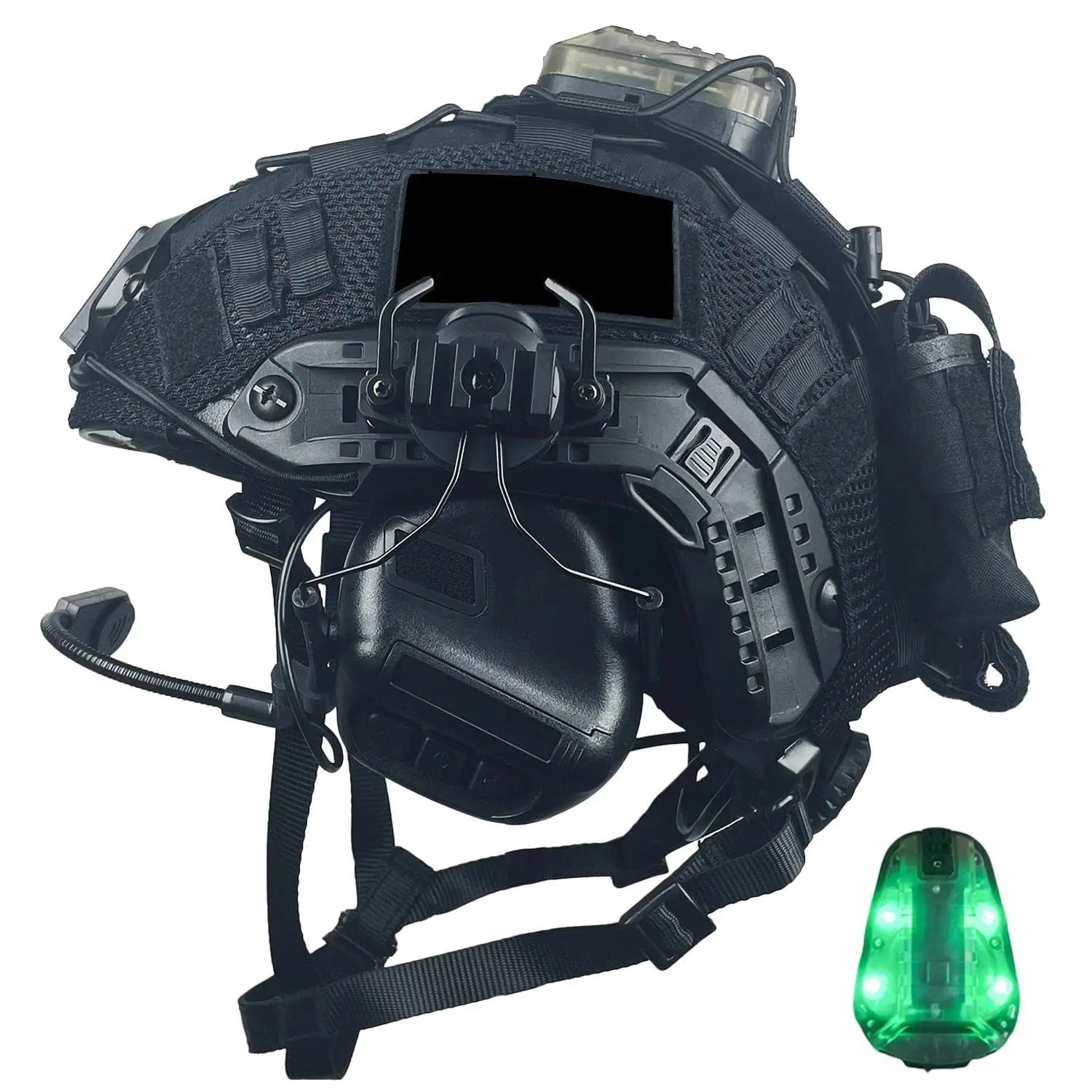 Kit completo de casco Airsoft (7 componentes esenciales): casco RÁPIDO tipo PJ, auricular táctico, funda para casco, simulado GPNVG-18, soporte L4G24, luz para casco y bolsa de contrapeso de batería, todo para su configuración táctica
