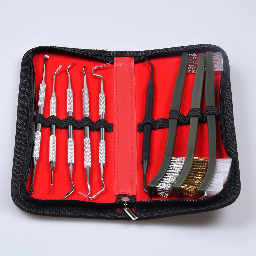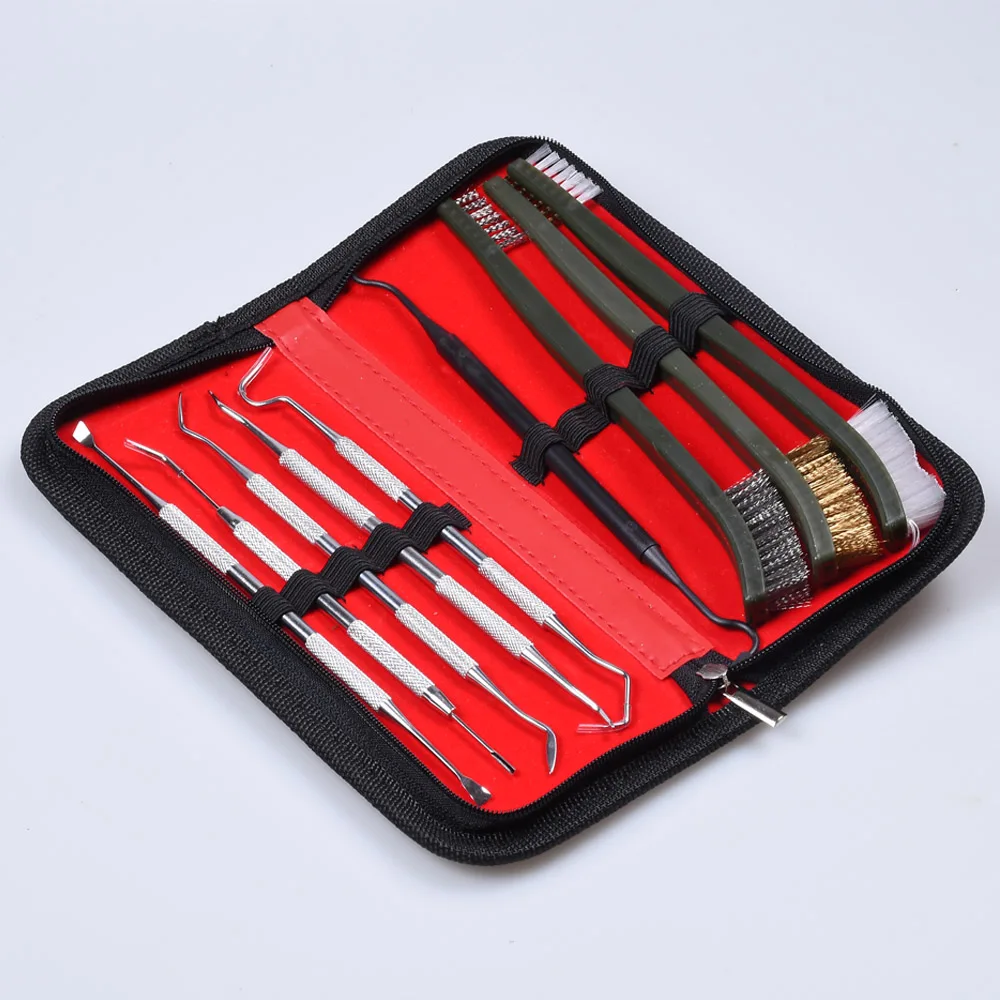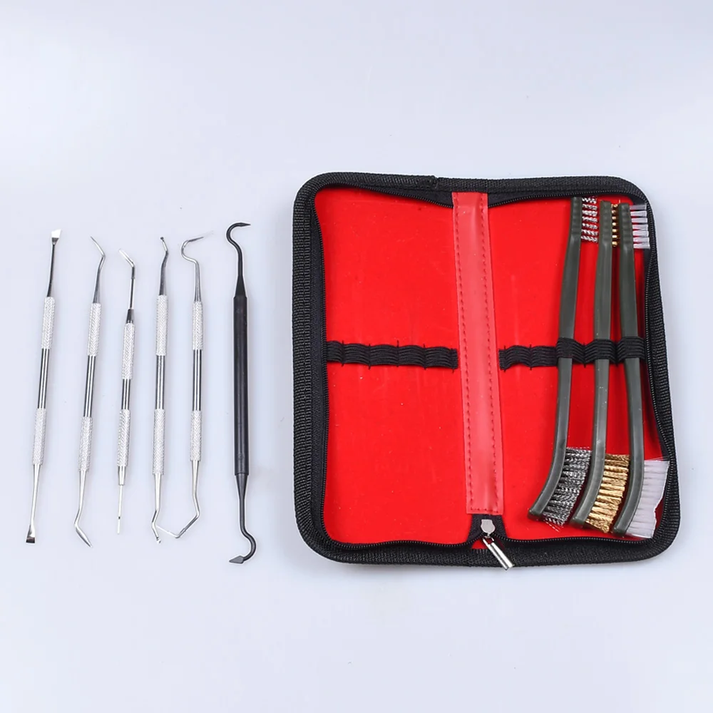 Cepillos multimateriales: capacidad de limpieza versátil con un extremo grande y pequeño para limpiar todo tipo de espacios difíciles de alcanzar. Las púas de doble punta son ideales para raspar suciedad y residuos de lugares difíciles de alcanzar. Los cepillos de nailon suave y latón son herramientas esenciales para limpiar todos los dispositivos. Los cepillos de acero se pueden utilizar en situaciones especiales.