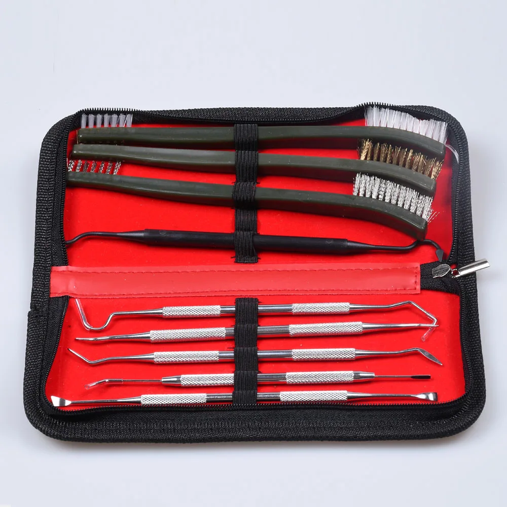 Púas con múltiples objetos afilados: Las púas de doble punta en diferentes formas son ideales para raspar la suciedad y los residuos de lugares difíciles de alcanzar. Las puntas de acero inoxidable son lo suficientemente afiladas y duras como para eliminar fácilmente cualquier enganche de carbono. La Púa de nailon es ideal para una limpieza ligera y la prevención de arañazos en la superficie de la pistola.