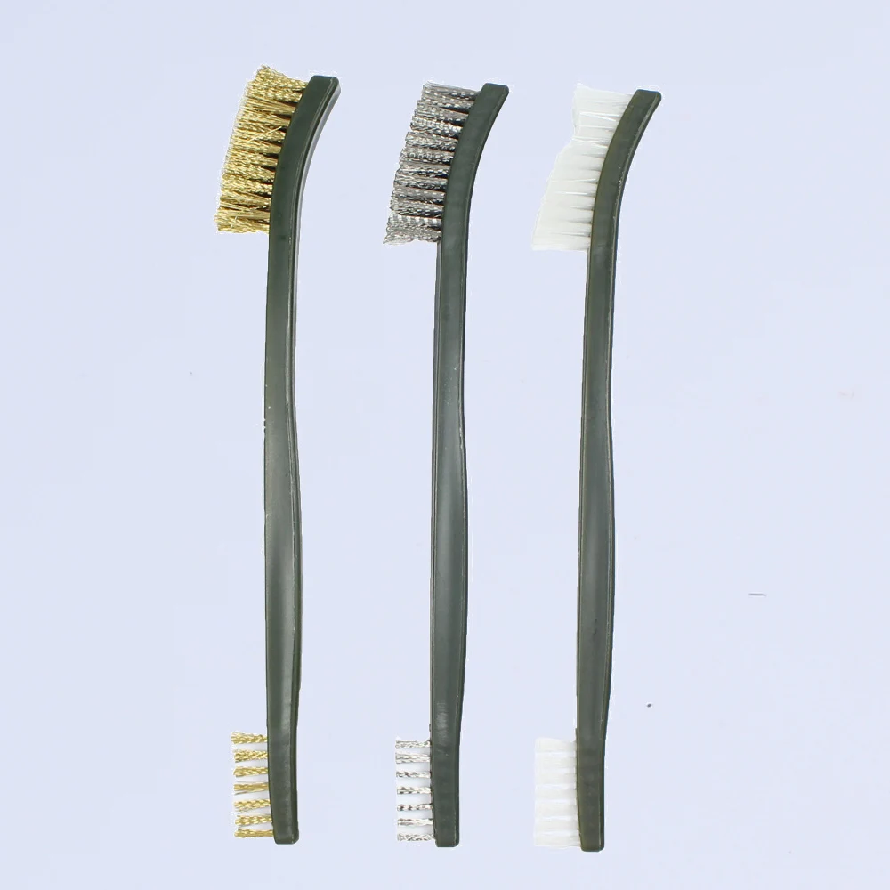 Kit de limpieza de pistola Airsoft, juego de pistola de caza, pistola de Rifle, limpieza Universal, cepillo de alambre de acero inoxidable, de nailon, 9, unids/set3 cepillos y 6 púas: cada kit de limpieza de pistola incluye 3 cepillos y 6 púas. Los 3 tipos de cepillos de doble punta son latón, acero y nailon. 5 púas de limpieza para armas son de acero inoxidable y una es de nailon.