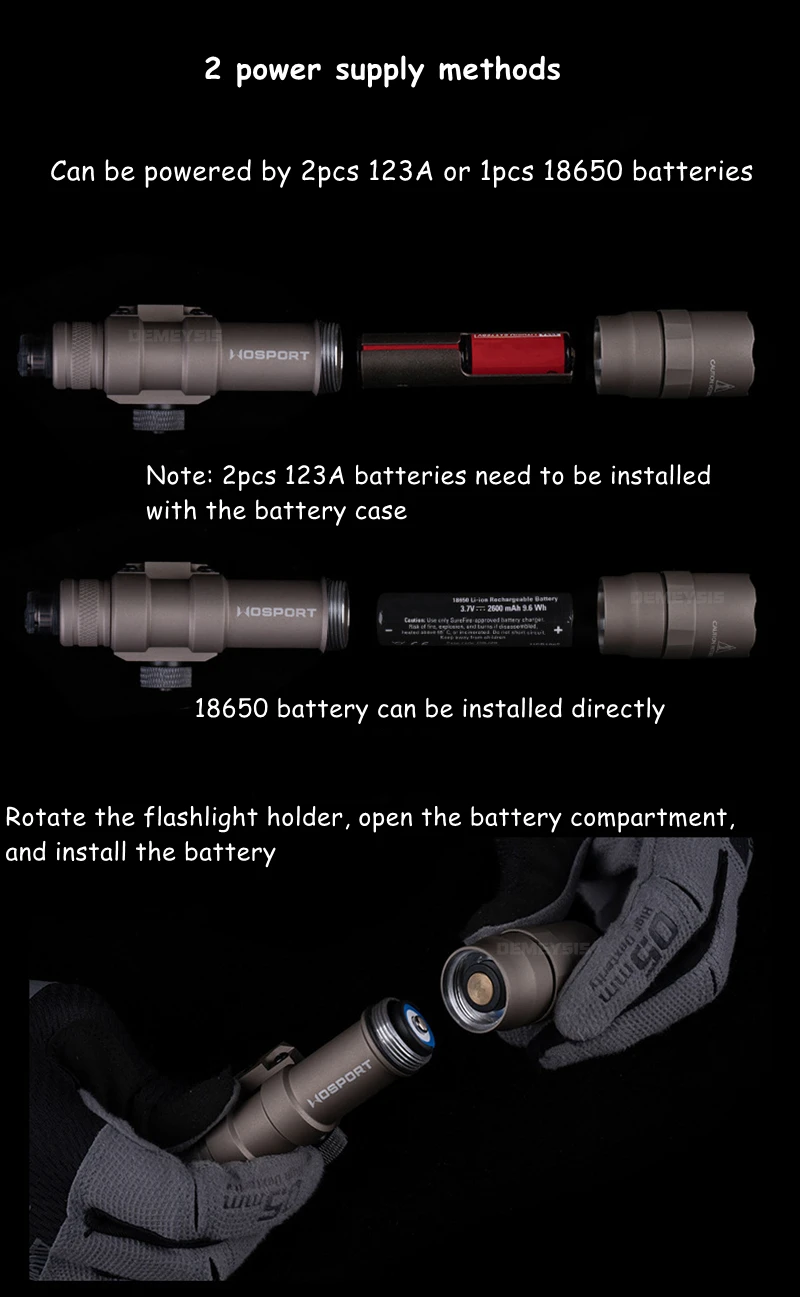 🔋 Opciones de alimentación dual– Admite baterías 2×123A o 1×18650