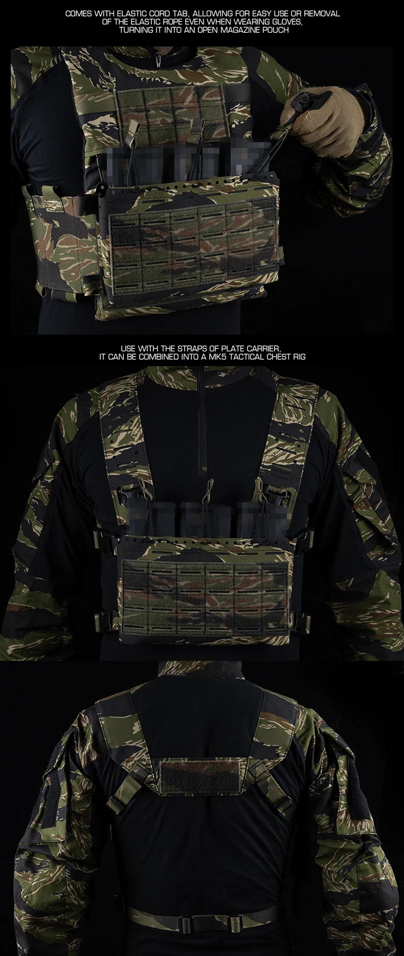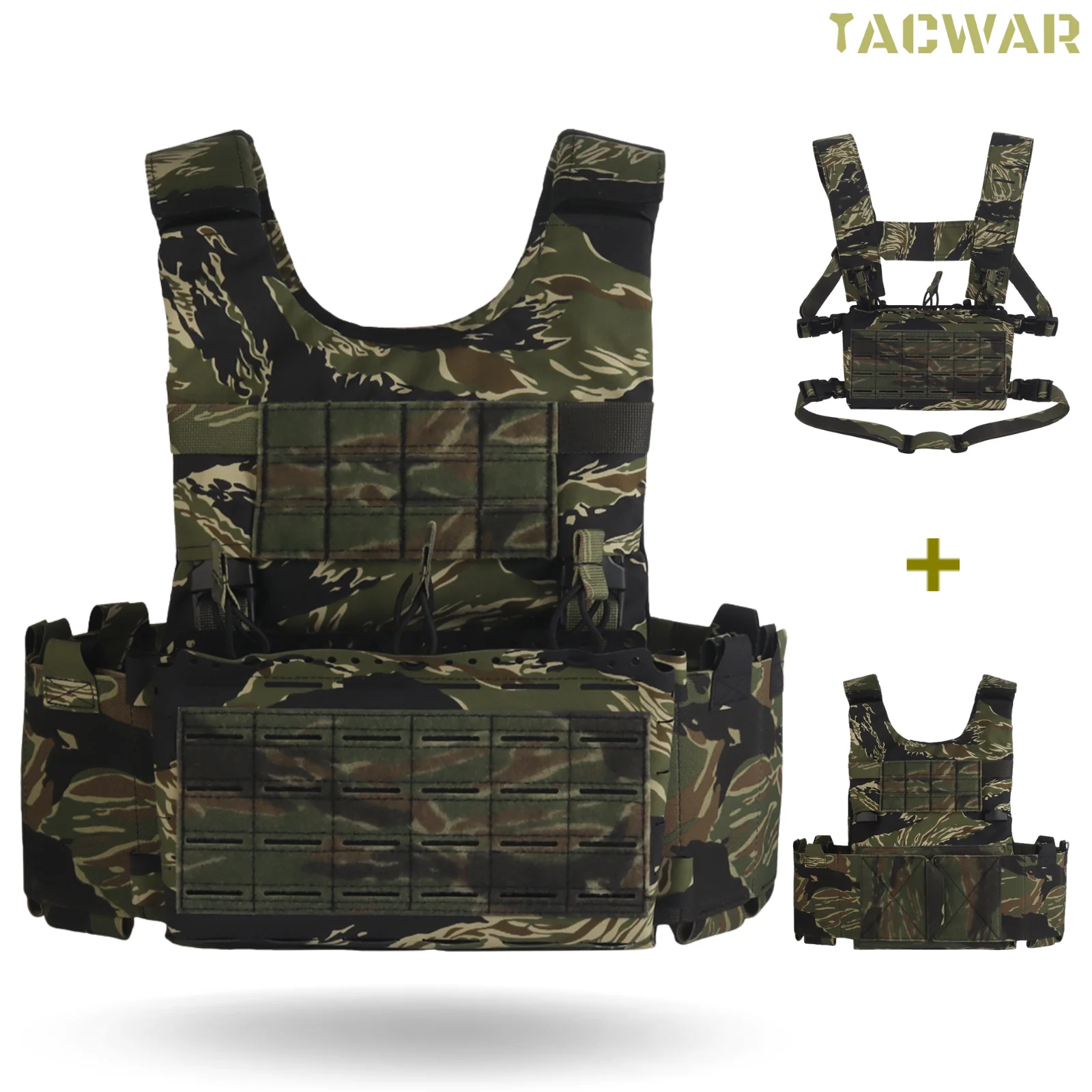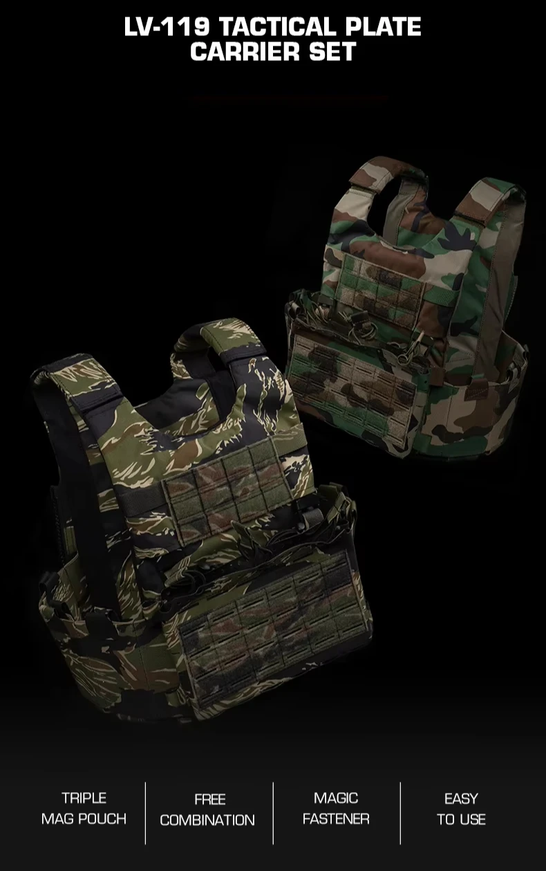 Juego de portador de placa de LV-119, chaleco de aparejo de pecho de bosque ligero con rayas de tigre de liberación rápida MOLLE 2 en 1 para Cosplay de caza Airsoft