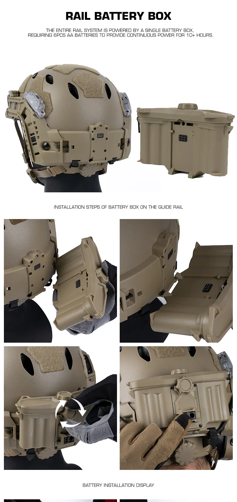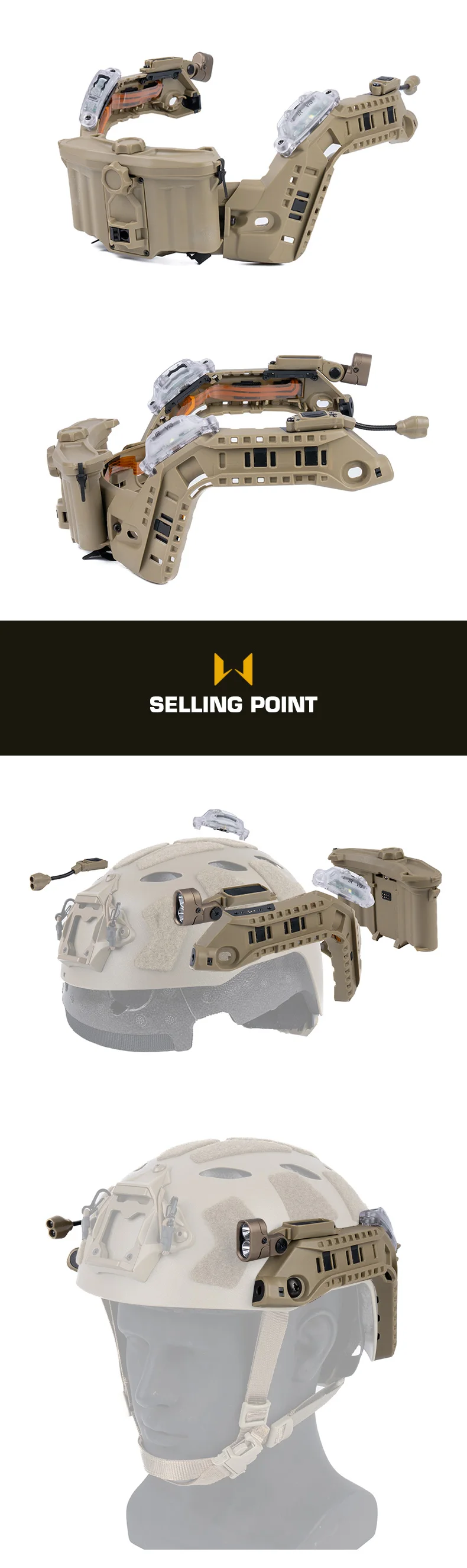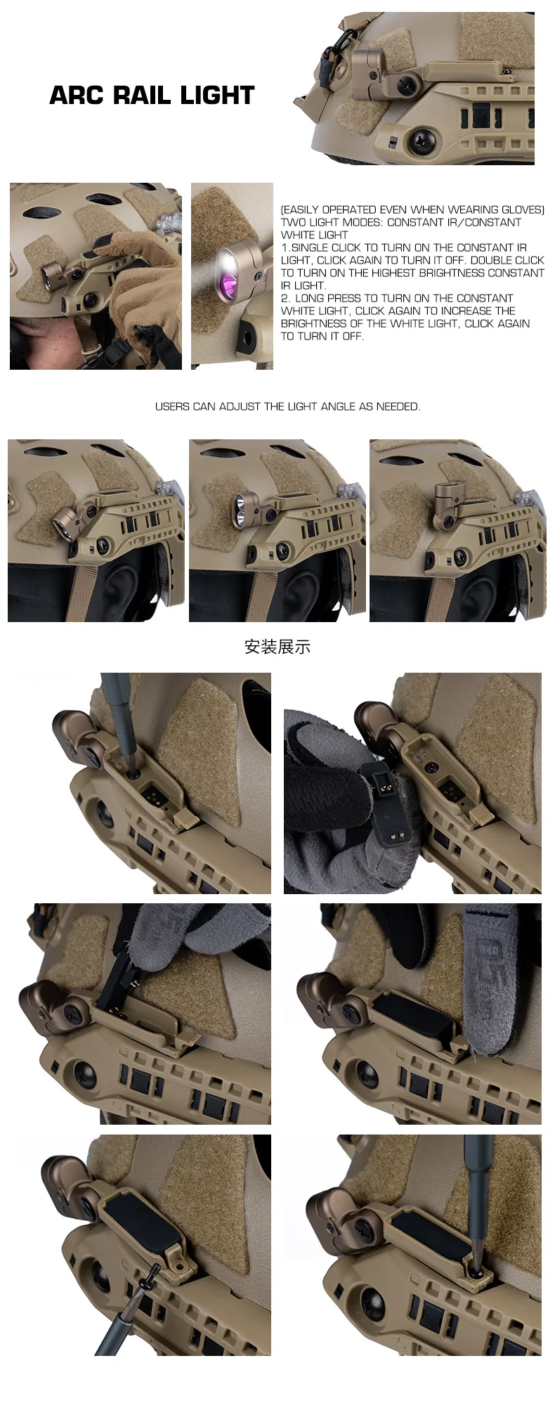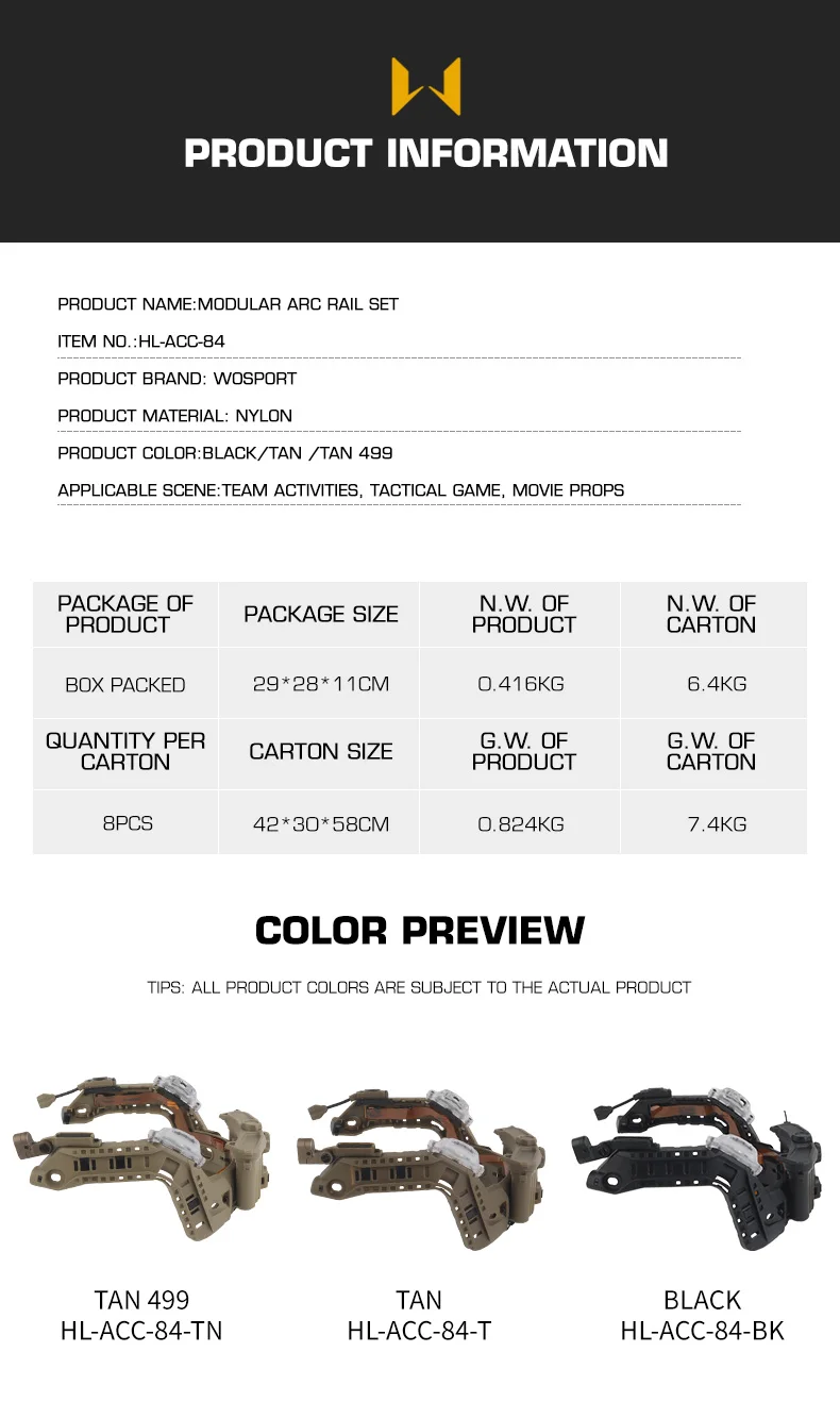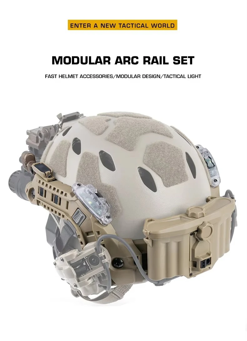 Juego de rieles ARC modulares con 5 posiciones de bloqueo Compatible con tamaños M/L/XL/XXL de cascos RÁPIDOS de corte súper alto Información del producto Nombre del producto: Juego de rieles ARC modular Artículo No.:HL-ACC-84 Material del producto: nailon Color del producto: Negro/Tanado/Tan 499 Escena aplicable: actividades de equipo, juegos tácticos, accesorios de película.