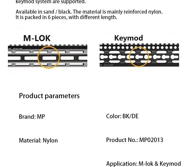 Diseñado para la compatibilidad con AR15, este juego de accesorios para rieles de polímero de 6 piezas es una opción versátil para varios modelos de armas.