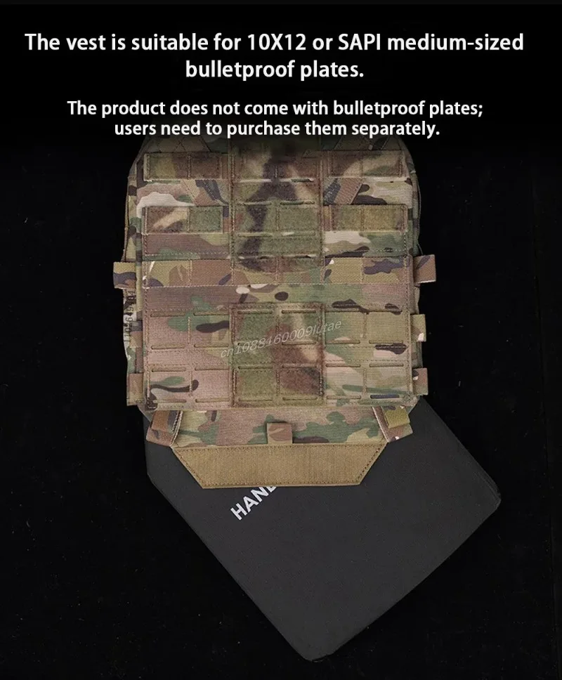 El Chaleco es adecuado para placas antibalas de tamaño mediano 10X12 o SAPI. El producto no viene con placas a prueba de balas; los usuarios deben comprarlas por separado.