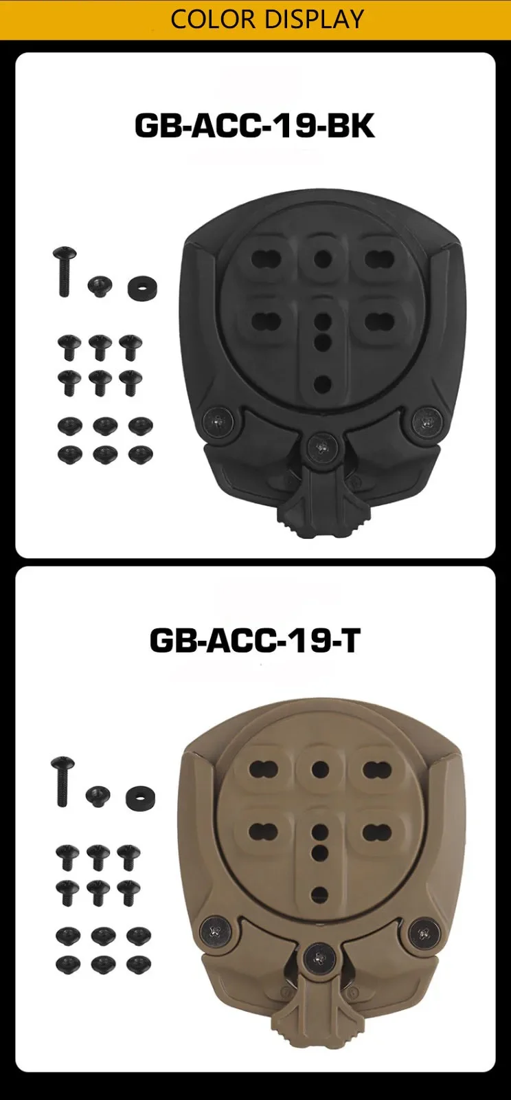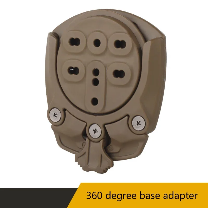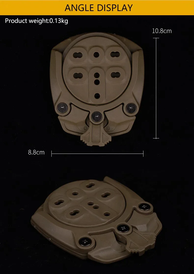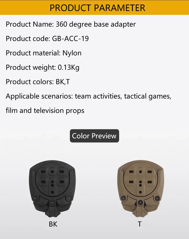 Nombre del producto: Adaptador de base de 360 gradosMaterial del producto: nailonPeso del producto: 0,13 kgColores del producto: BK, TEscenarios aplicables: actividades de equipo, juegos, accesorios de cine y televisión.