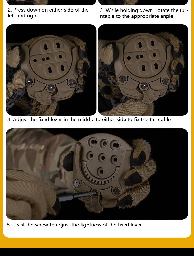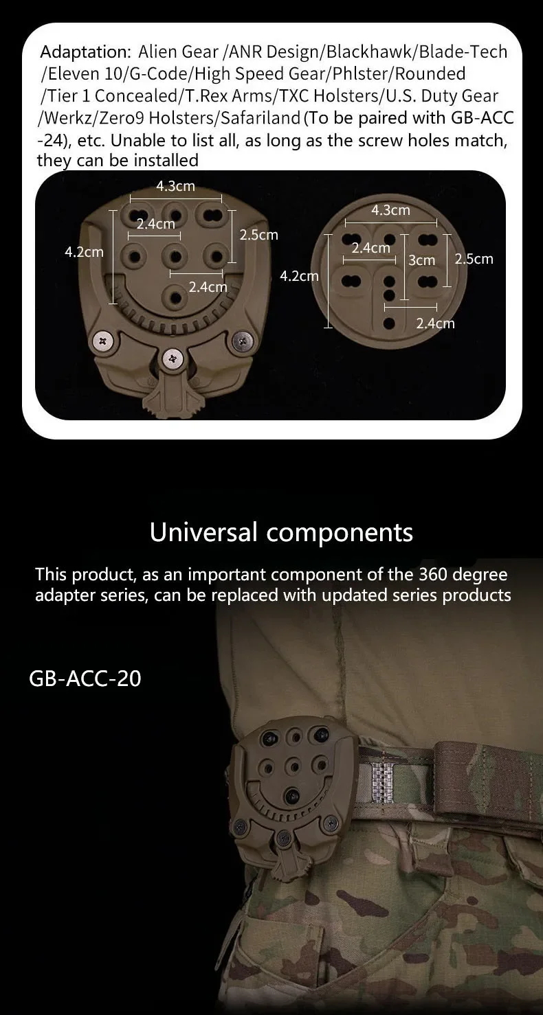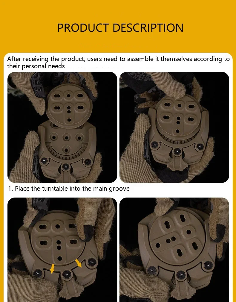 Nombre del producto: Adaptador de base de 360 gradosMaterial del producto: nailonPeso del producto: 0,13 kgColores del producto: BK, TEscenarios aplicables: actividades de equipo, juegos, accesorios de cine y televisión.
