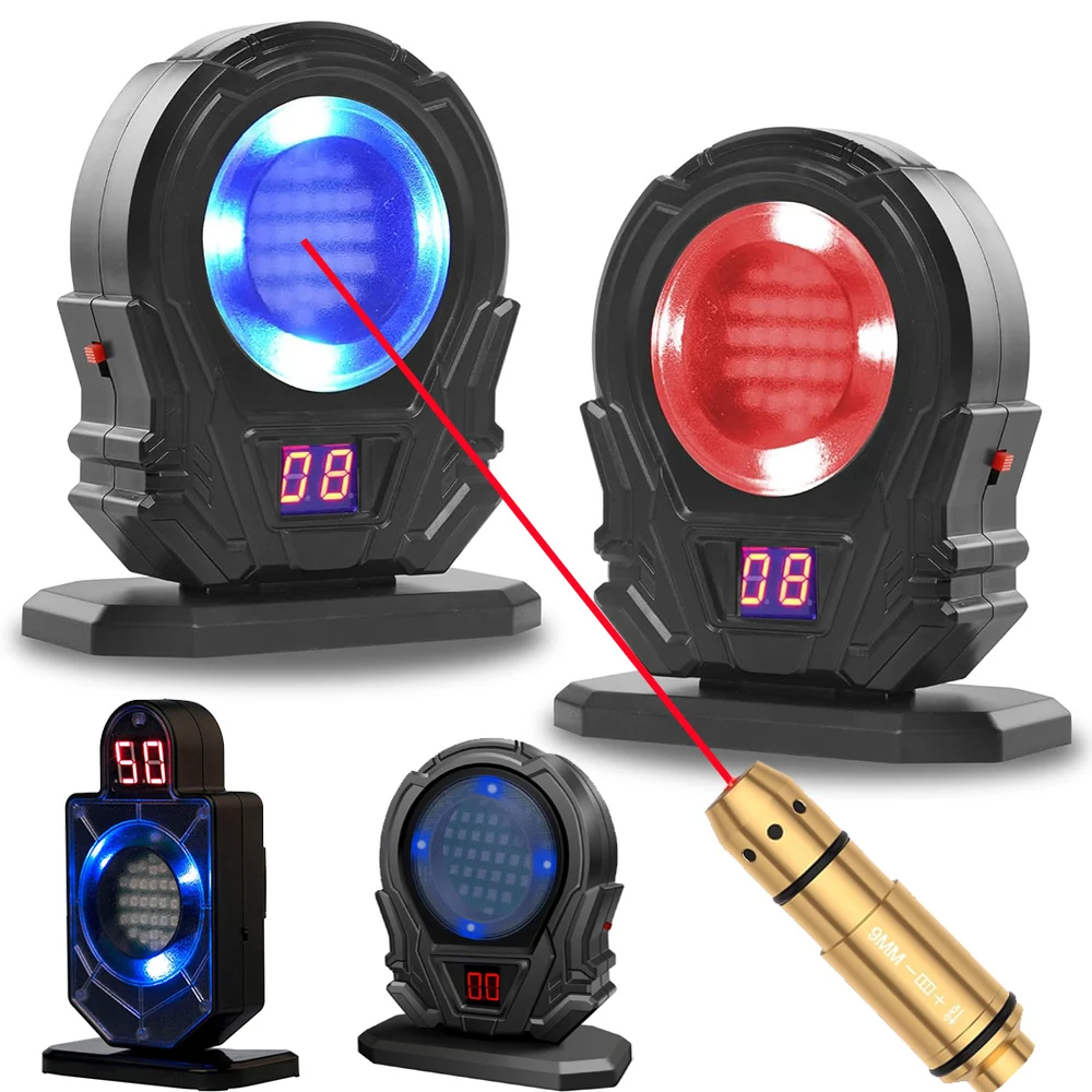 2. 【Objetivo láser de decoloración】 Nuestro entrenador de objetivos láser completo con sensores, contadores y luces indicadoras rojas y azules cambiables.Para usarlo, inserte 3 pilas AAA en la parte posterior, encienda el botón lateral y emparéjelo con su pistola láser para comenzar a practicar;una luz indicadora roja o azul se iluminará alrededor del objetivo y cambiará a rojo intermitente cuando toque el objetivo con éxito;Utilice el contador encima del objetivo para registrar su puntuación.
