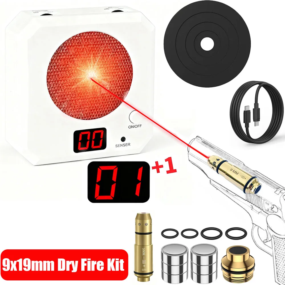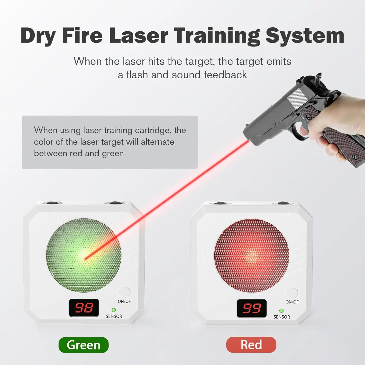 1. 【Compatibilidad】 Láser clase IIIA, menos de 5 mW. El objetivo de entrenamiento láser con activación de sonido y luz es una herramienta ideal para entrenamiento de fuego seco y apto para todos los cartuchos de entrenamiento láser y dispositivos de cargador de fuego seco con láser.Cuando el láser golpea el objetivo, el objetivo emite un destello de luz, números acumulados y retroalimentación sonora, que acumula hasta 99 golpes de copa.