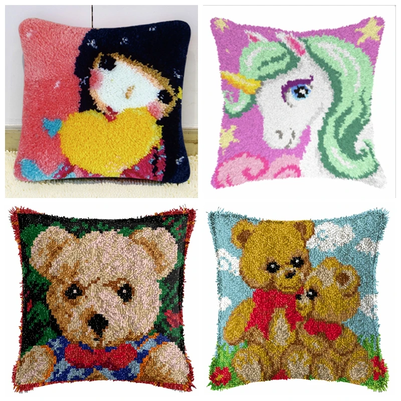 Kit de gancho de pestillo de unicornio de animales, cojines artesanales bordados para niña, paquete de almohada con nudo, paquete de botones de Smyrna, artesanía de red DIY