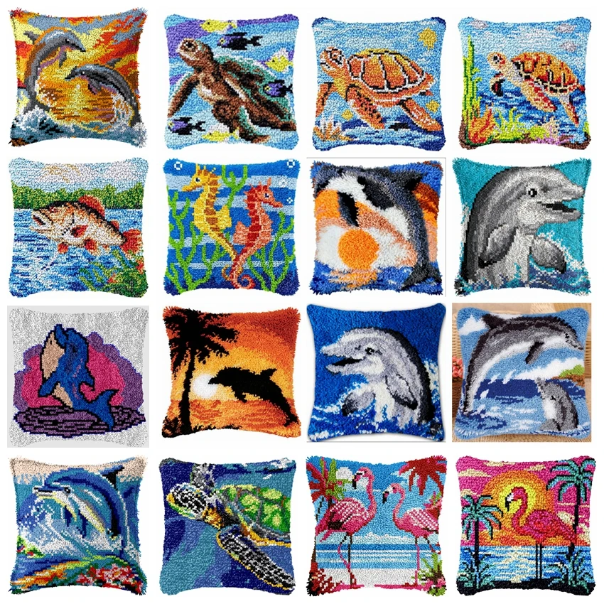 Kit de gancho de pestillo con patrón de tortuga de delfines, paquete de almohada con nudo Vintage, Kits de gancho de pestillo bordado, funda de almohada con cojín de animales del océano
