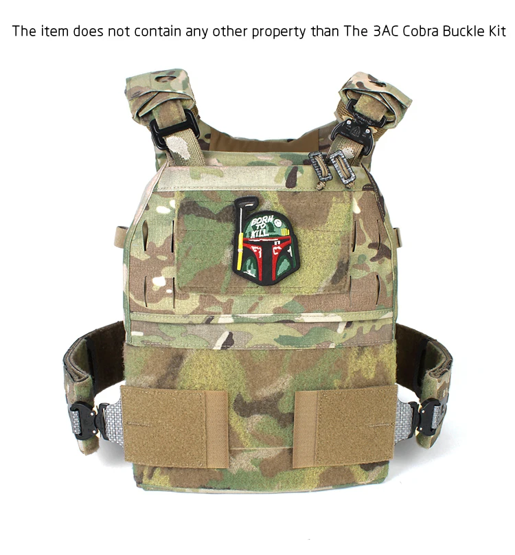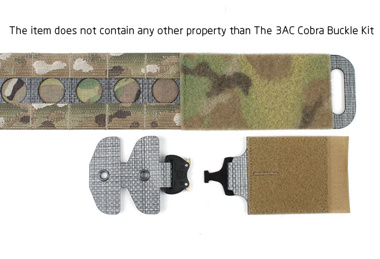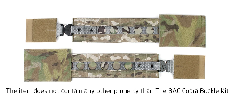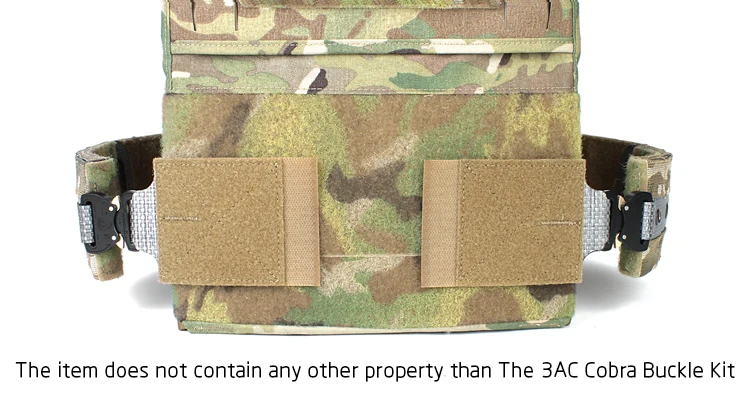 El Kit de hebilla 3AC Cobra convierte el accesorio de Velcro delantero 3AC cummerbunds en una fácil conexión don/doff entre la parte delantera del cummerbund y los bolsillos de la placa delantera del portador de placa. Esto permite al Usuario mantener la solapa delantera hacia abajo y asegurada al tiempo que elimina la necesidad de levantar la solapa delantera para desmontar el portador de la placa. Las bolsas compatibles con MOLLE aún se pueden instalar directamente en la parte superior del soporte de hebilla lateral cummerbund.