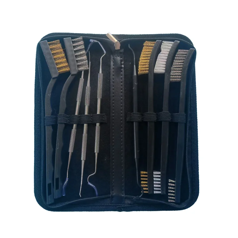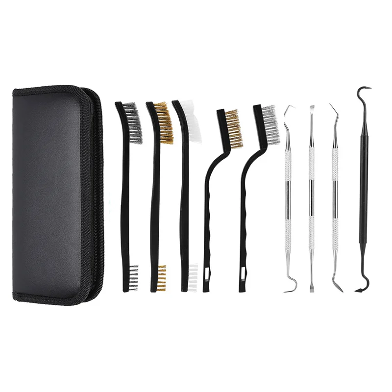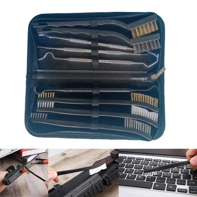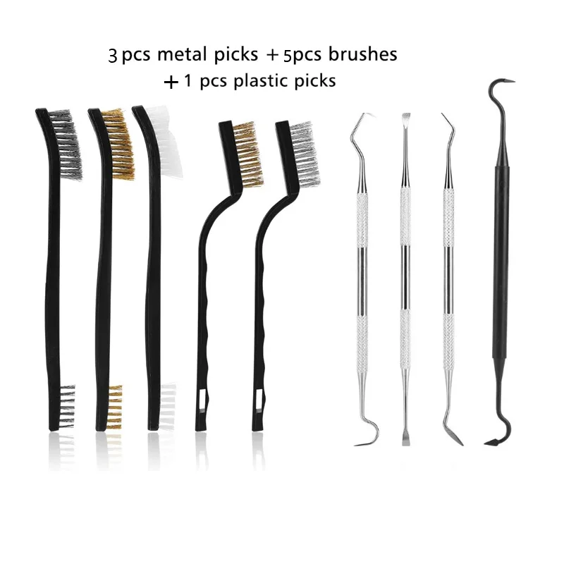 2. Tres púas de acero inoxidable tienen 6 herramientas diferentes para limpiar casi todas las piezas diferentes de todas las pistolas.Accederán fácilmente a cualquier rincón pequeño y áreas ranuradas (aproximadamente 6,8 de largo) para limpiar cualquier rince de carbono.También agregamos una picadora para una limpieza suave en partes débiles de la pistola.