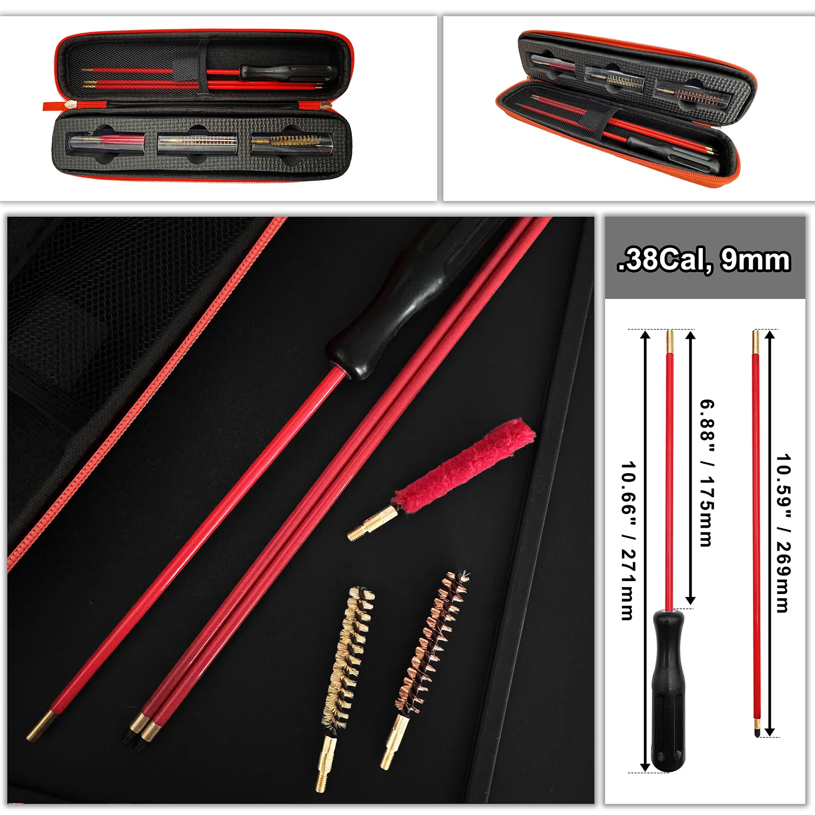 [.38Cal, kit de limpieza de 9mm]-Varilla de limpieza + 2 postes de extensión + cepillo de nailon de 9 mm + cepillo de bronce de 9 mm + cepillo de fregona de 9 mm + estuche de almacenamiento de limpieza