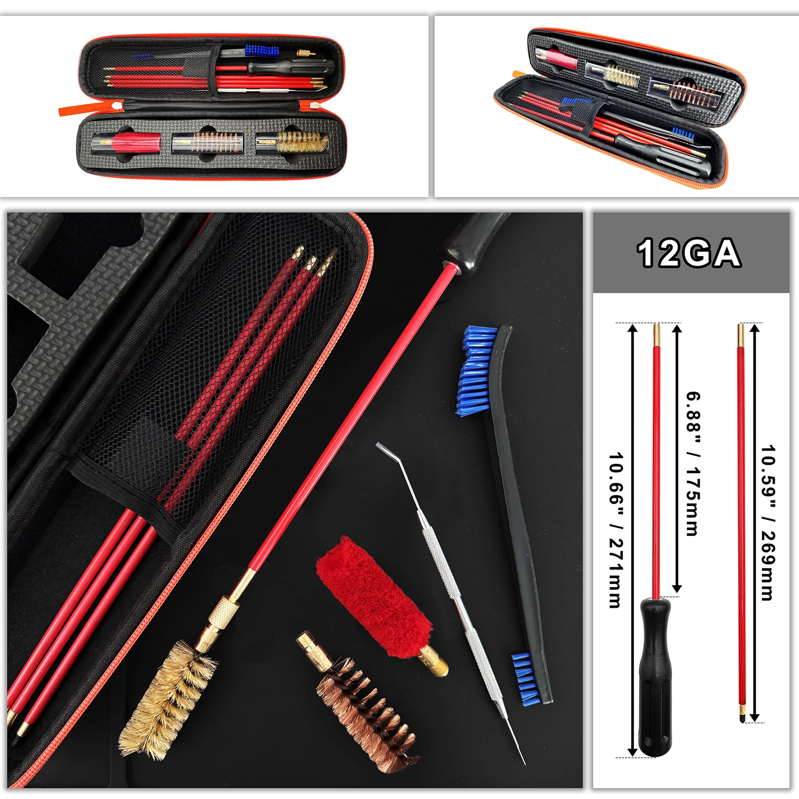 [Kit de limpieza 12GA]-Varilla de limpieza + 3 postes de extensión + cepillo de nailon 12GA + cepillo de bronce 12GA + cepillo de fregona 12GA + cepillo de nailon de doble cabezal + púas de limpieza de acero inoxidable + estuche de almacenamiento de limpieza