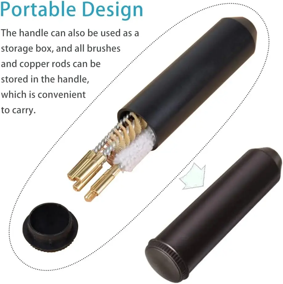 2.【Cepillos duraderos para limpieza de armas】El cepillo de diámetro incluye un cepillo de cerdas de bronce y un cepillo de latón, puede comenzar con el cepillo de latón para eliminar la suciedad rebelde y la acumulación de carbono del cañón de la pistola y las piezas de metal duro moviéndolo hacia adelante y hacia atrás dentro del cañón.Siga con el cepillo de cerdas de bronce para una limpieza detallada de componentes de precisión como el conjunto del gatillo y la cámara, cepillándose suavemente para eliminar partículas finas y residuos.