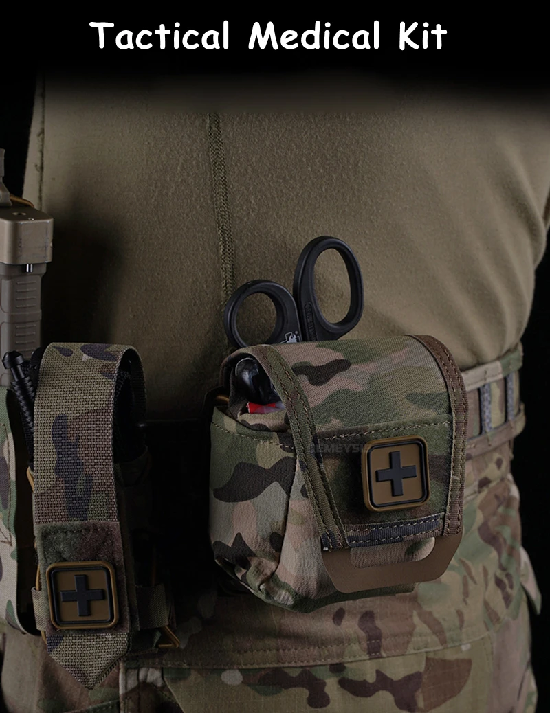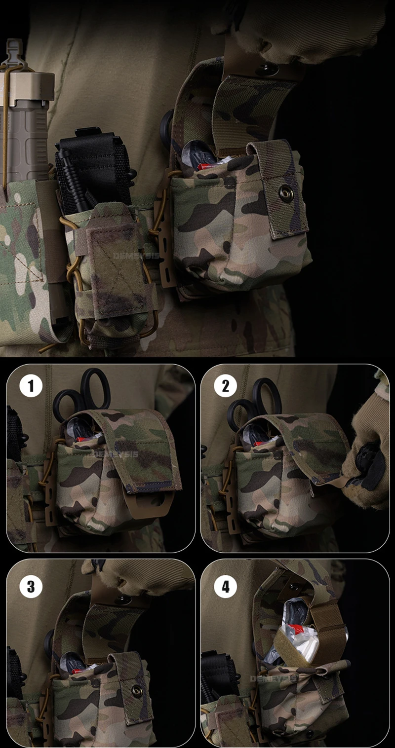 ●Equipado con clips MOLLE.Es fácil y conveniente instalar y quitar la bolsa médica de su cinturón de servicio o chaleco táctico.