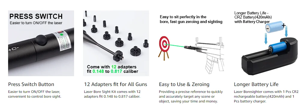 Este kit de seguidor consta de un emisor y series de adaptadores expandibles que cubren diámetros de calibre de 0,177 a 0,78 pulgadas y 12GA.