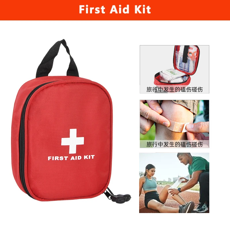 Bolsa de primeros auxilios, Tijera, Pinzas, Torniquete, Alfileres de seguridad, Vendaje elástico, Cinta adhesiva, Máscara de RCP, Tiritas, Tiritas redondas, Mini tiritas, Vendaje para heridas, almohadilla de gasa estéril, instrucciones del botiquín de primeros auxilios.