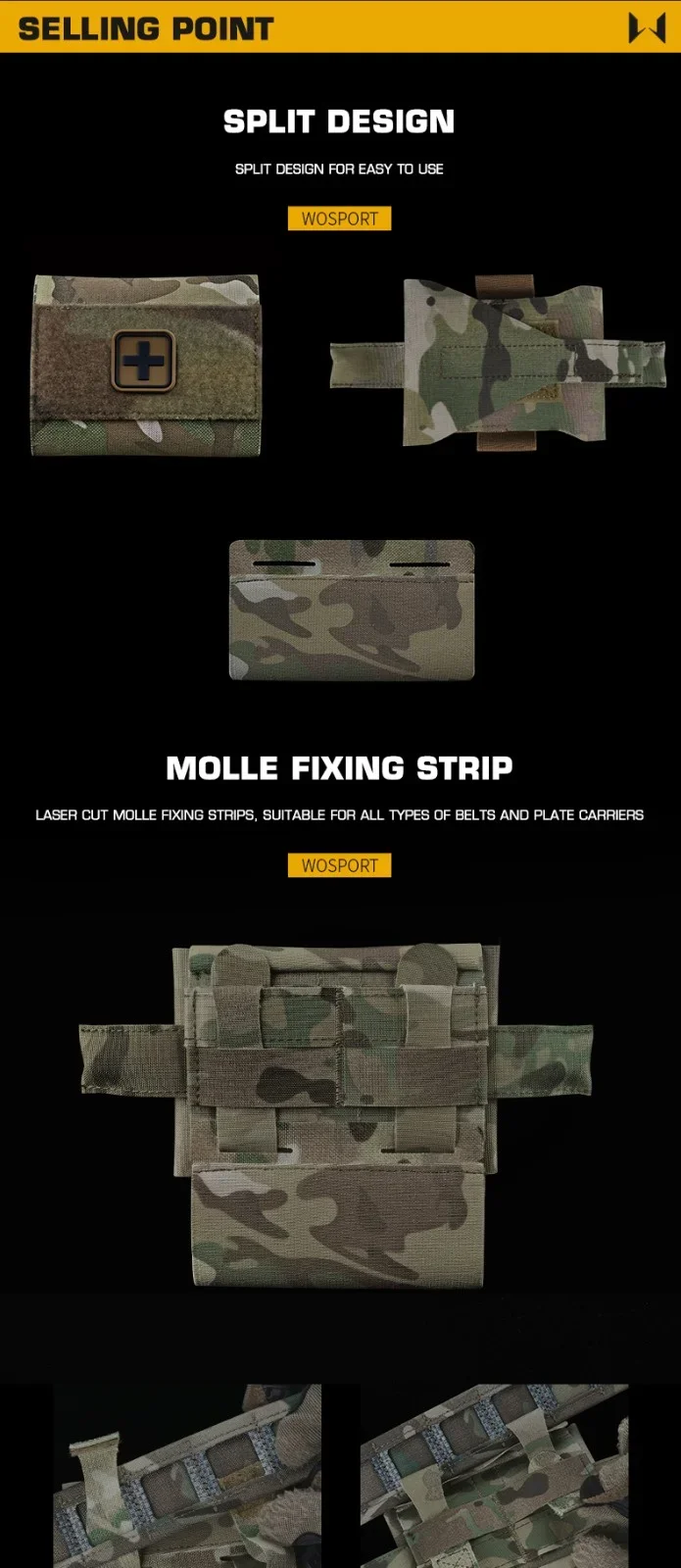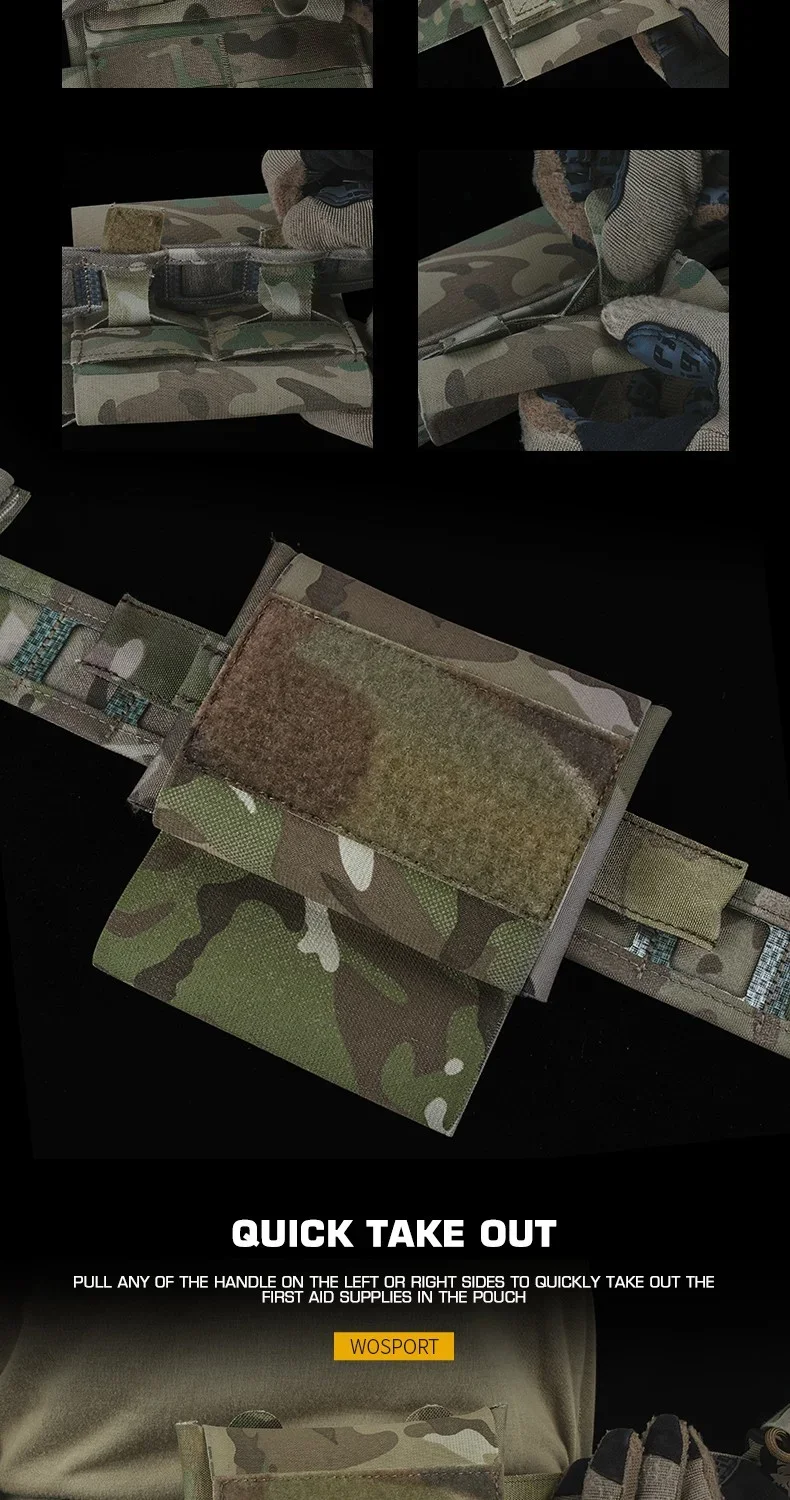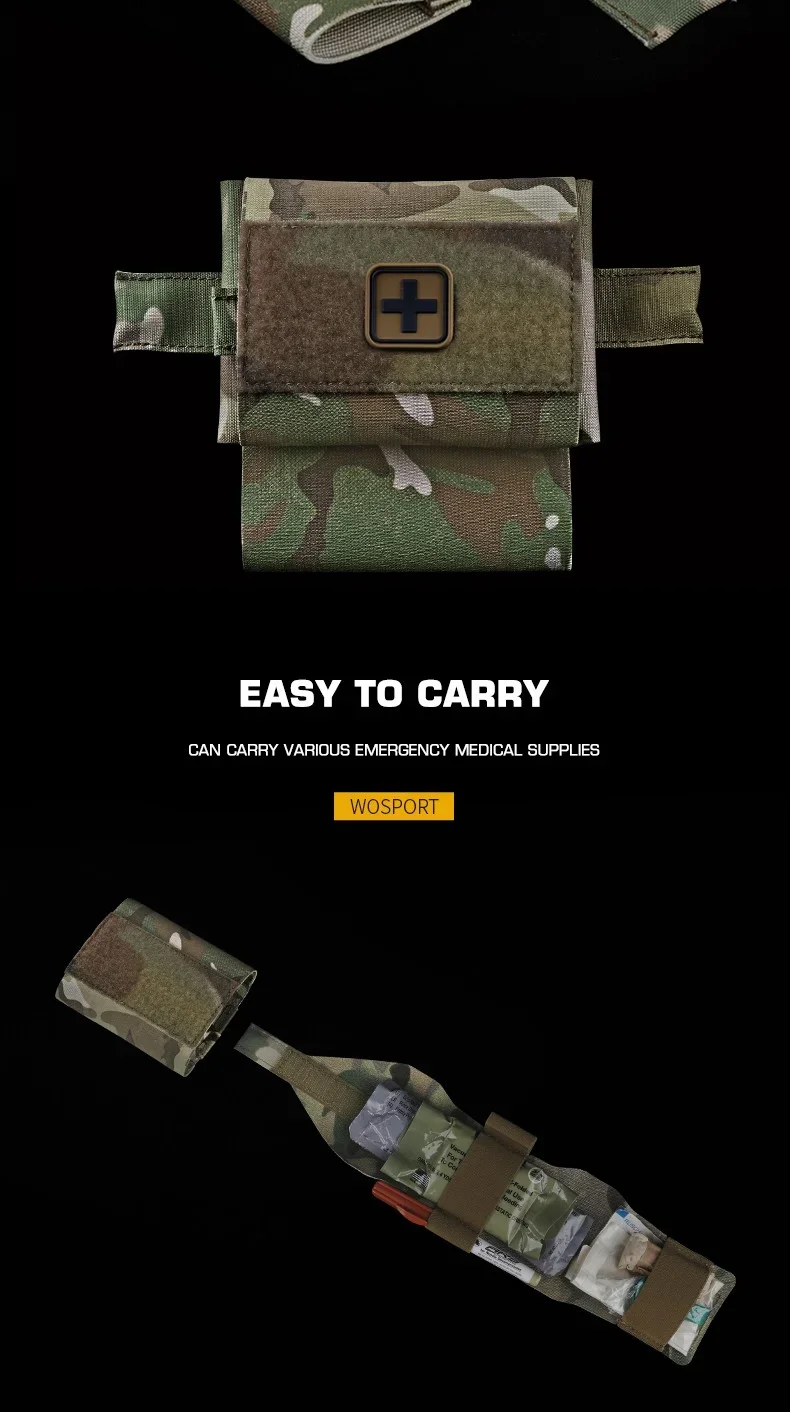 Características: 1 Dos componentes principales: bolsa exterior montada en Molle e inserto interior extraíble. 2 Capaz de sacar el inserto con una mano o un solo dedo del lado izquierdo o derecho. 3 Mantenga el material médico organizado y disponible para un acceso instantáneo. 4 La hamaca con torniquete no tiene más espacio de montaje adicional y protege el torniquete del medio ambiente. 5 MOLLE o accesorio montado en correa. 6 Con inserción de cruz de identificación roja y blanca.
