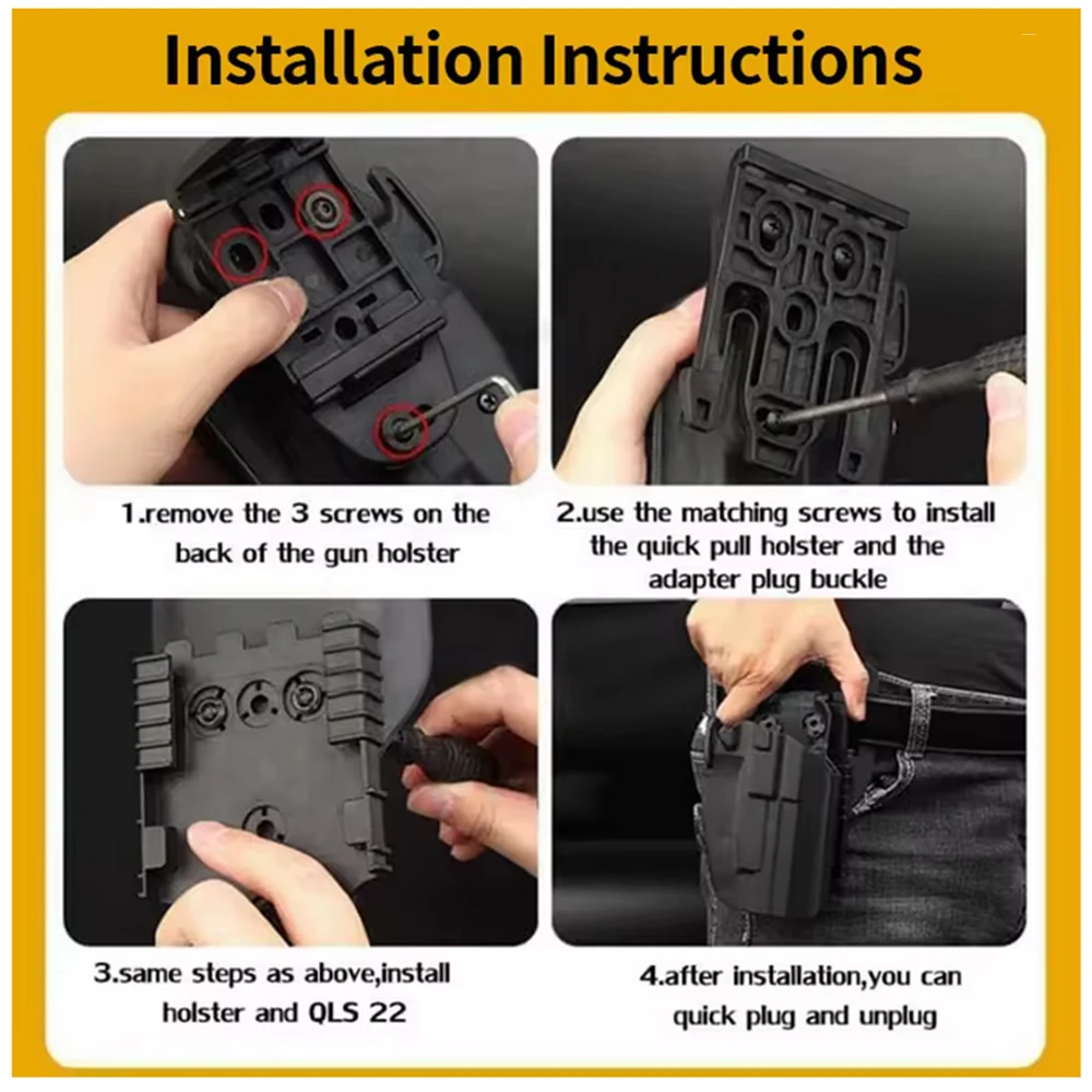 La placa receptora se puede montar en la mayor parte de la plataforma que desea mantener su pistola de forma segura, incluido su chaleco MOLLE, cinturón de trabajo, placa táctica para piernas, viaje alto/medio/bajo, muebles, automóviles y MÁS.
