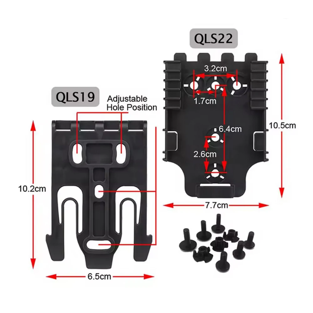 Este kit de sistema de bloqueo QLS funciona con todas las fundas Safariland con un patrón de 3 orificios.