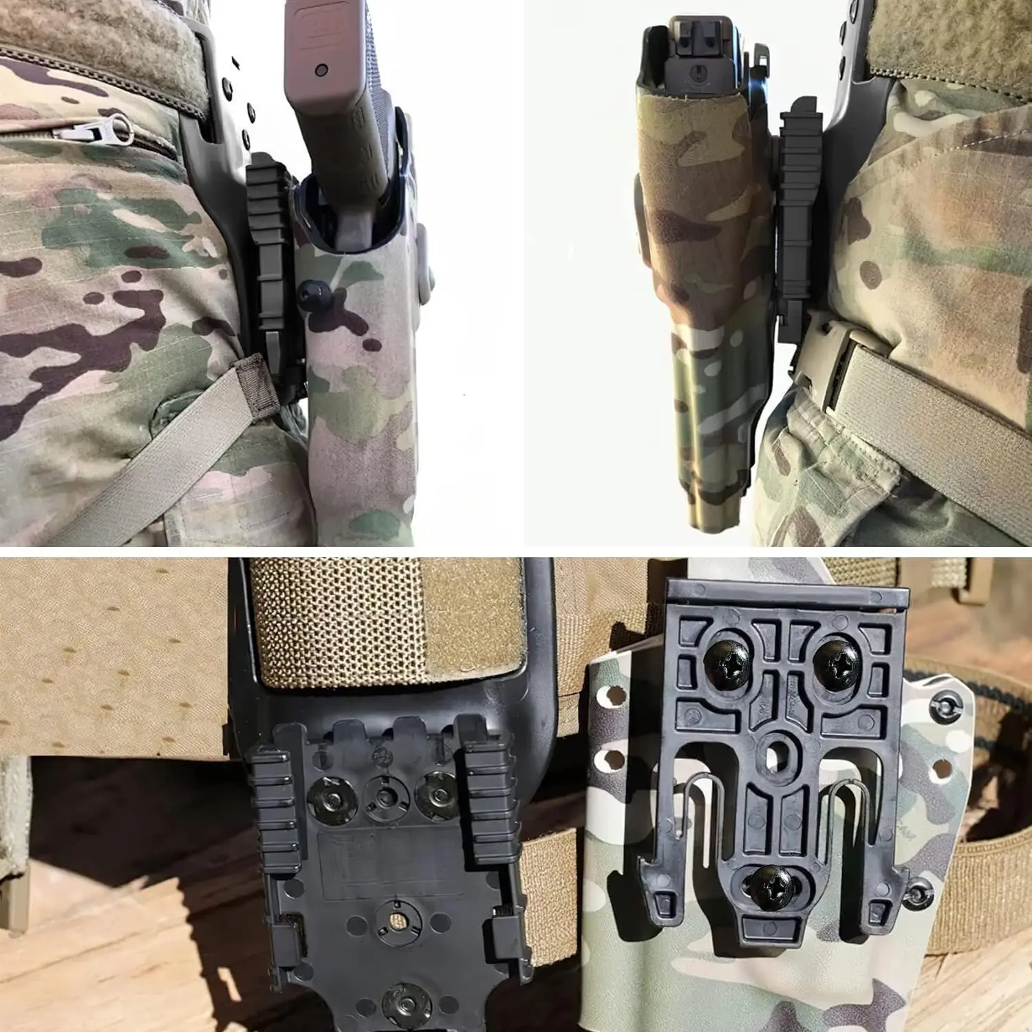 Lo que le permite cambiar fácilmente las fundas con un soporte para cinturón (por ejemplo,Low-Ride, Belt Slide o Paddle).Sin tener que quitar todo el equipo del cinturón y volver a enhebrar otra funda.
