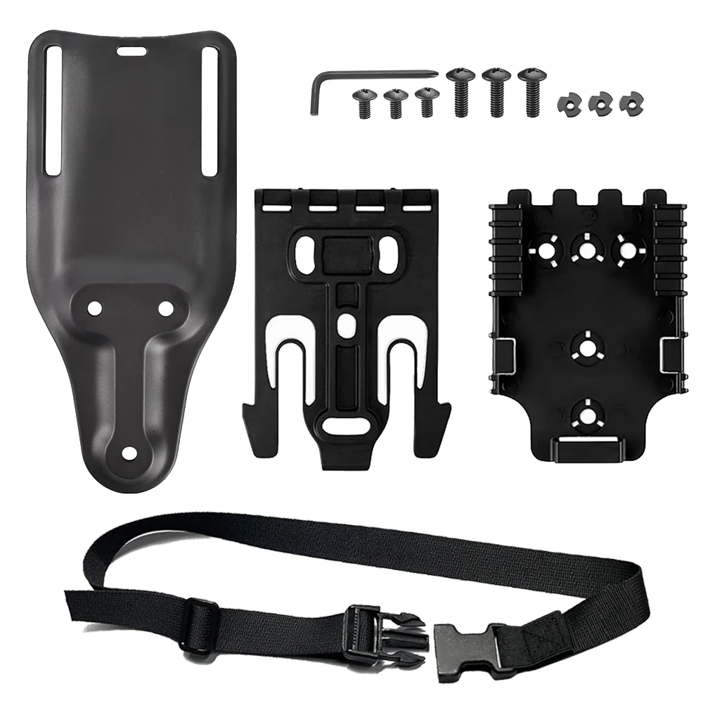 Los productos incluyen: kit de sistema de bloqueo rápido + correa elástica para muslo + presilla para cinturón universal.