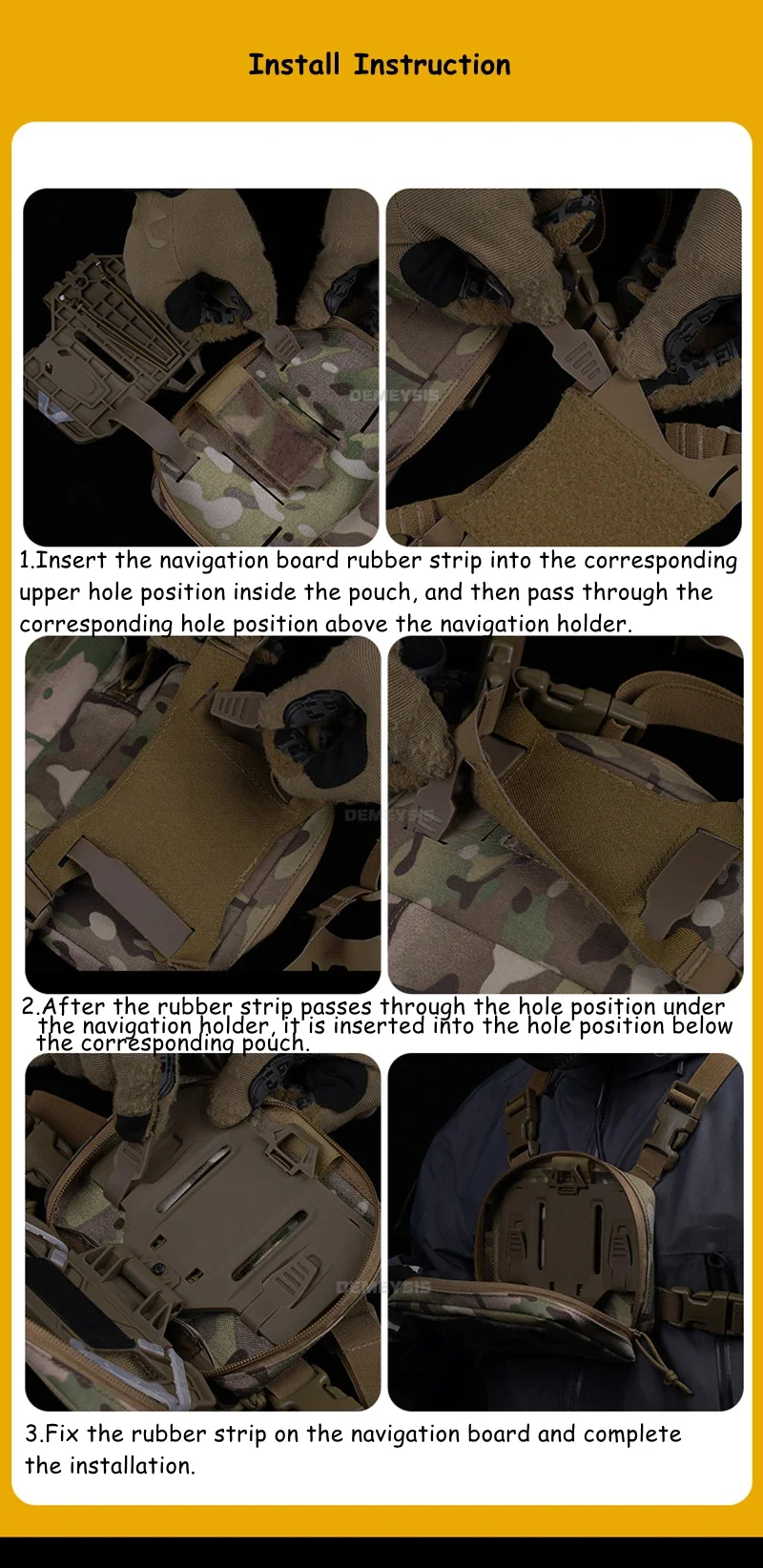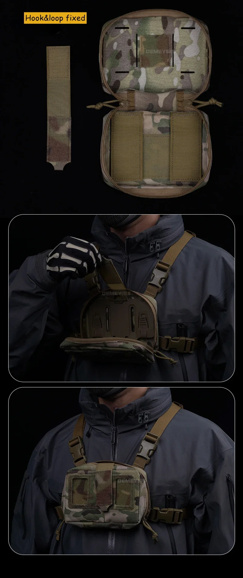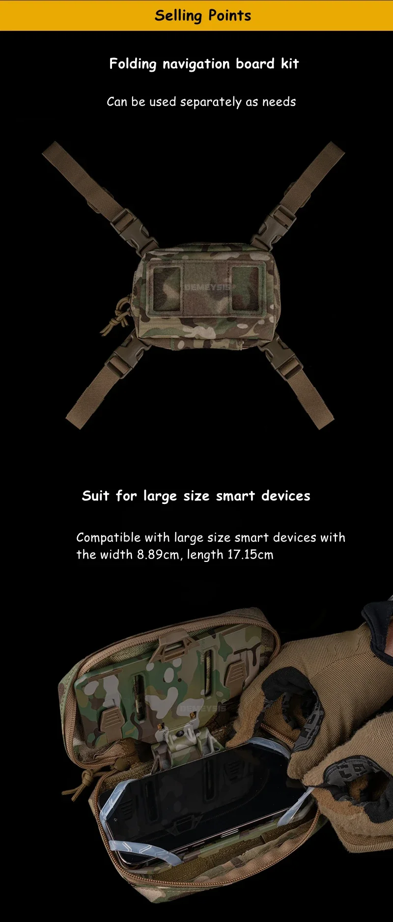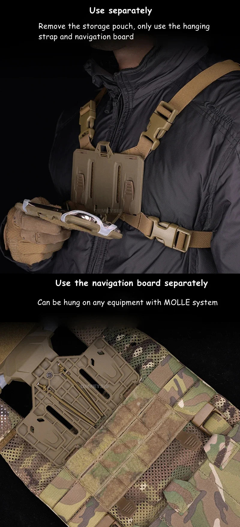 ●Úselo por separado.Retire la bolsa de almacenamiento, utilice únicamente la correa para colgar y la tabla de navegación.Se puede colgar en cualquier equipo con sistema MOLLE.