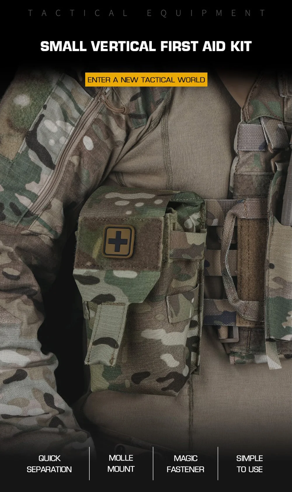 Nombre del producto: botiquín de primeros auxilios vertical pequeño Número de artículo.:BP-109-A Tamaño del producto: 24*16*2cm Peso neto del producto: 0,11 kg. Peso bruto del producto: 0,131 KG Color del producto: negro mate/gris lobo/verde Ranger/marrón coyote/MC/MCBK Material principal: tela Cordura. Escena aplicable: caza, deportes al aire libre y otros accesorios tácticos de atletismo Airsoft CS, etc.