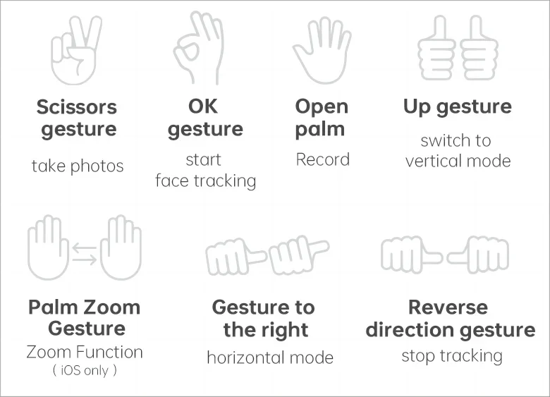 Features a built-in extendable pole for wider-angle selfies and group shots. Use intuitive gestures (scissors to shoot, open palm to record, OK sign to track) for hands-free control, perfect for solo creators.