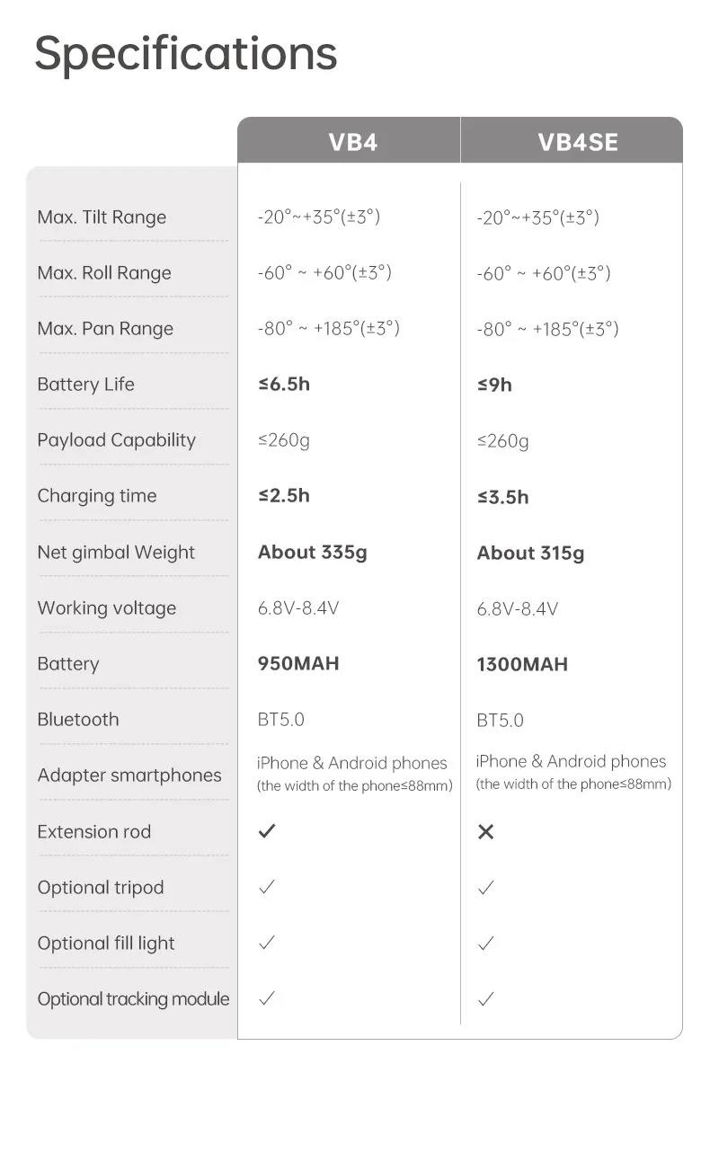 Weighing just 335g, the VB4 is ultra-portable yet powerful, supporting devices up to 260g. Its versatile design includes a multi-function dial for zoom/focus control, one-touch vertical/horizontal switching, and a durable tripod for hands-free setups. The optional magnetic fill light and AI tracker further enhance your creativity, ensuring perfect lighting and framing in any environment.