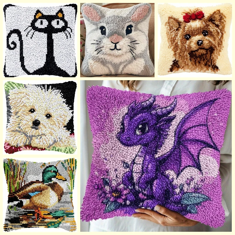 Kits de alfombrilla de gancho con pestillo de conejo y gato de dinosaurio, paquete de almohadilla de botón de animales DIY, Smyrna klink haak, almohada bordada, knooppakket