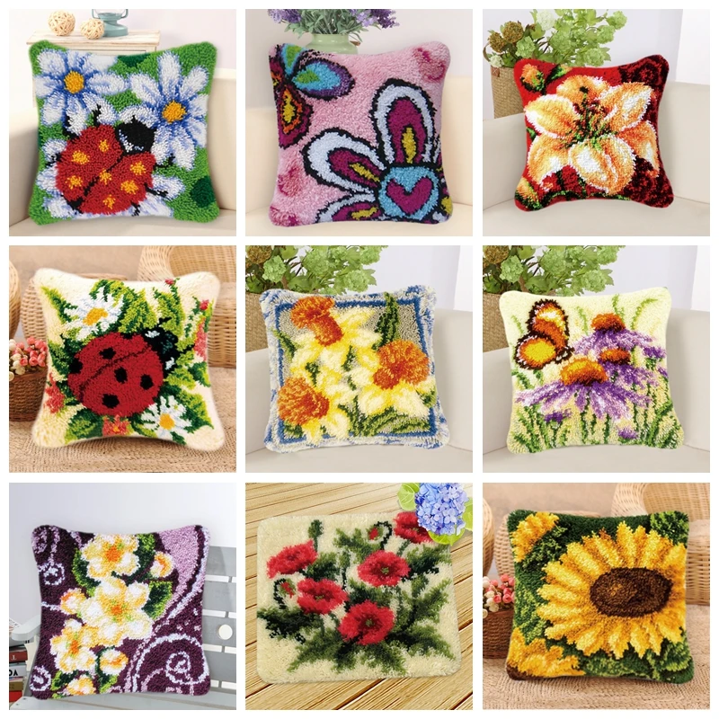 Kits de ganchos de pestillo de flores, juego de bordado de alfombras, paquete de botones Smyrna, tapiz, aguja, arte, artesanía, botón, paquete de cojín, preimpresión