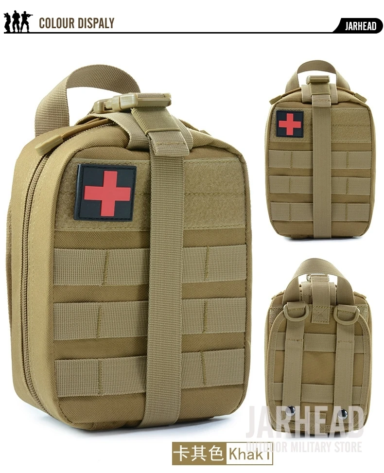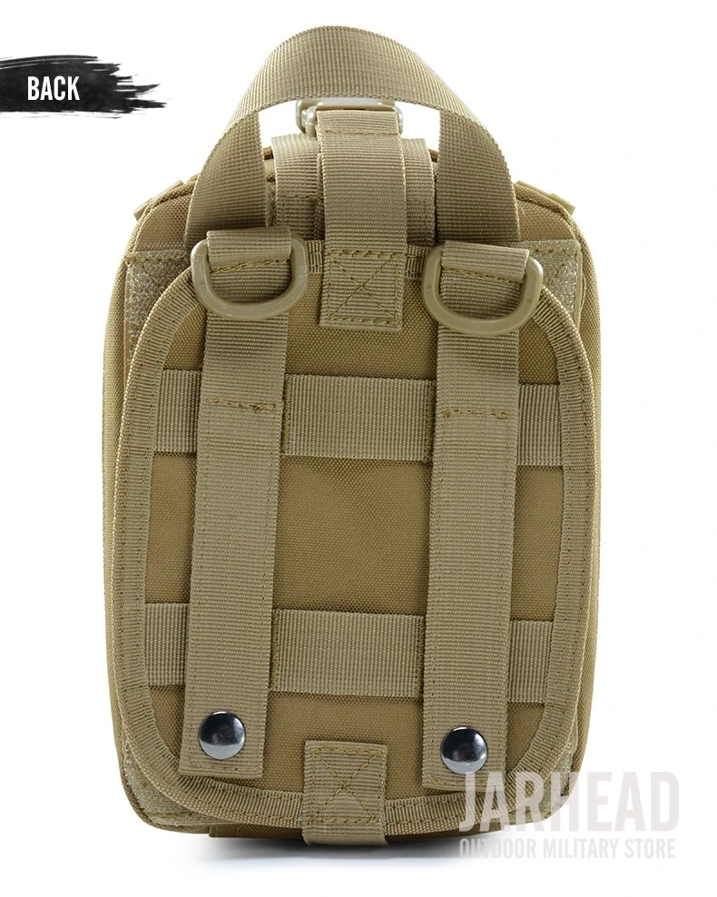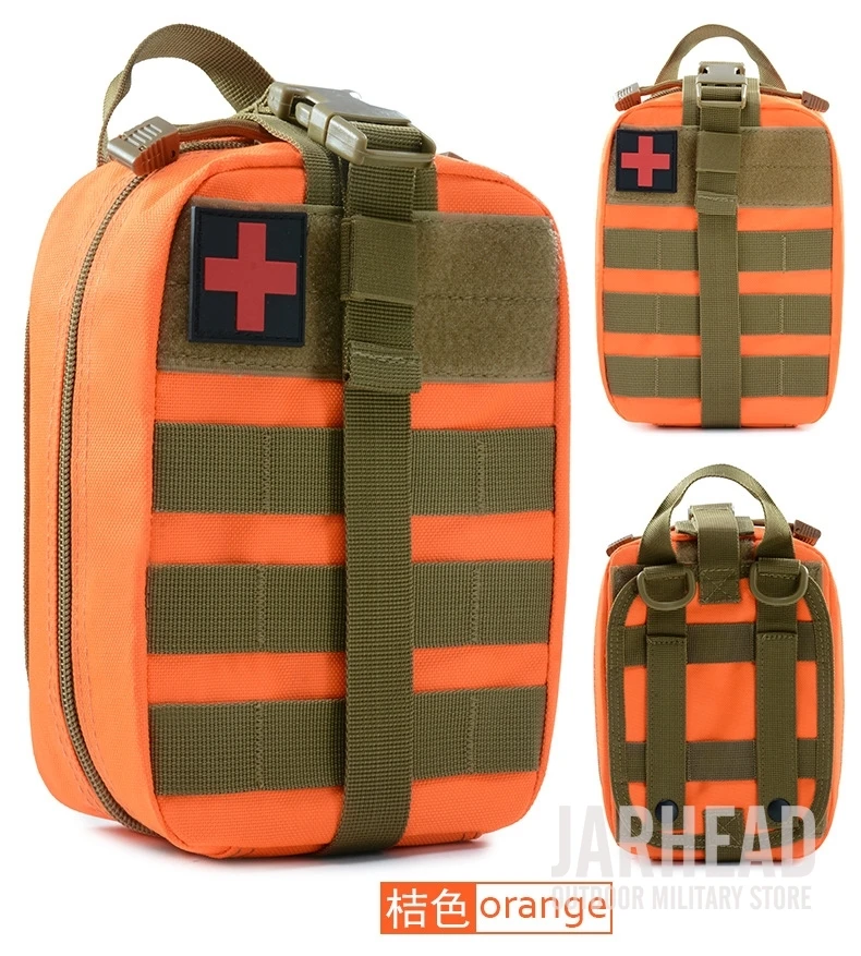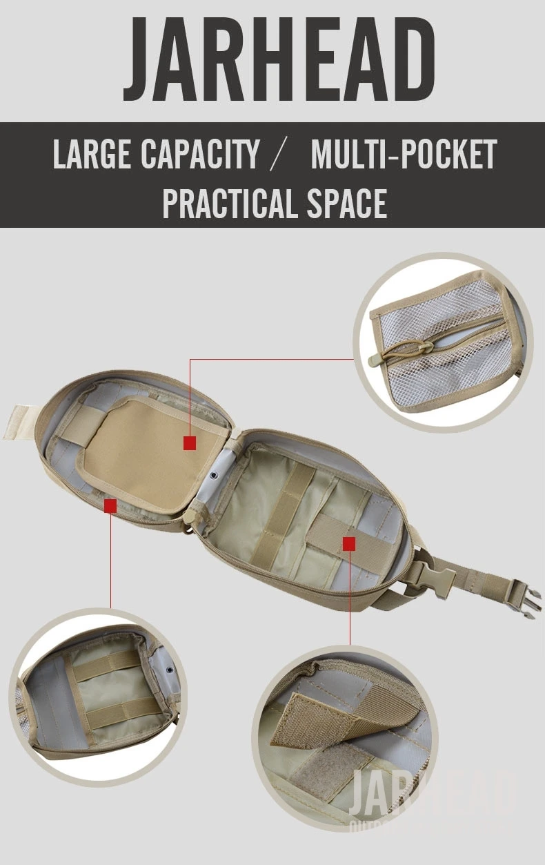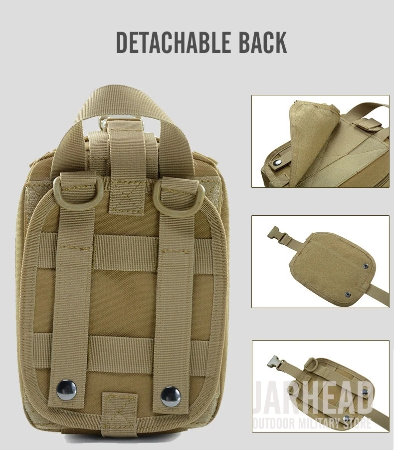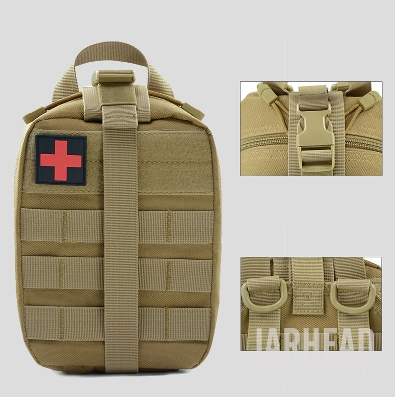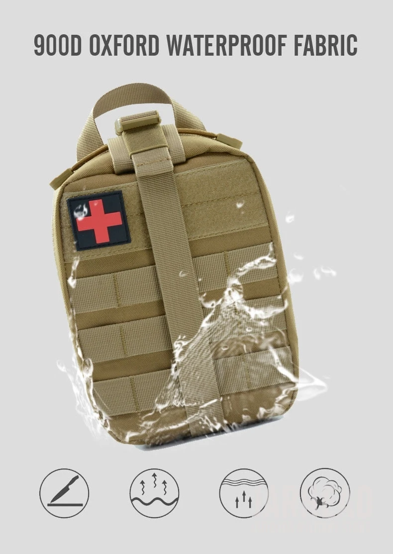 Esta bolsa médica de primeros auxilios para exteriores está diseñada para primeros auxilios y emergencias. Con un diseño de tres pliegues, Esta bolsa tiene 3 compartimentos espaciosos que contienen múltiples bolsillos y fuertes lazos elásticos para suministros médicos e instrumentos. El Cierre de doble cremallera permite un fácil acceso a sus suministros de primeros auxilios. Las correas molle con broches fuertes son convenientes para acoplar a cualquier engranaje compatible con MOLLE. Hecho de poliéster 600D de alta calidad, esta bolsa es resistente al desgarro y está diseñada para durar mucho tiempo. Es esencial para viajar, senderismo, montañismo, ciclismo, caza y muchas otras actividades al aire libre.