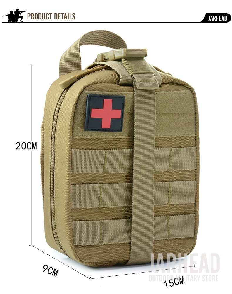 Características:Bolsa de primeros auxilios de 8 "* 7" * 3,5 " (H * W * D) hecha de poliéster 600D antiabrasión, herramienta necesaria para situaciones de emergencia.