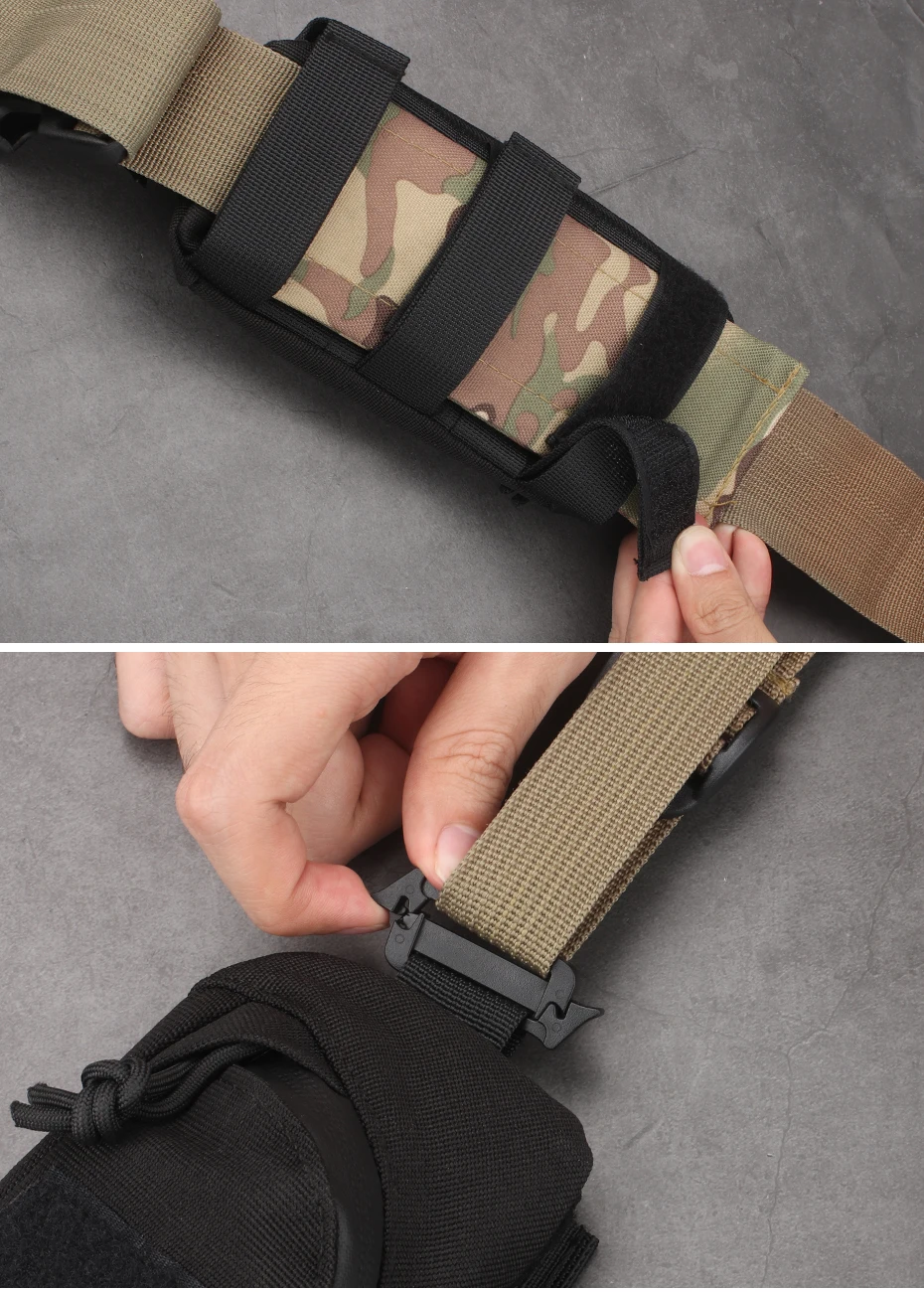 2. Sistema Molle. La correa trasera de tres molle es conveniente para que la cuelgue en su cinturón táctico, chaleco táctico, mochilas como accesorio adicional.