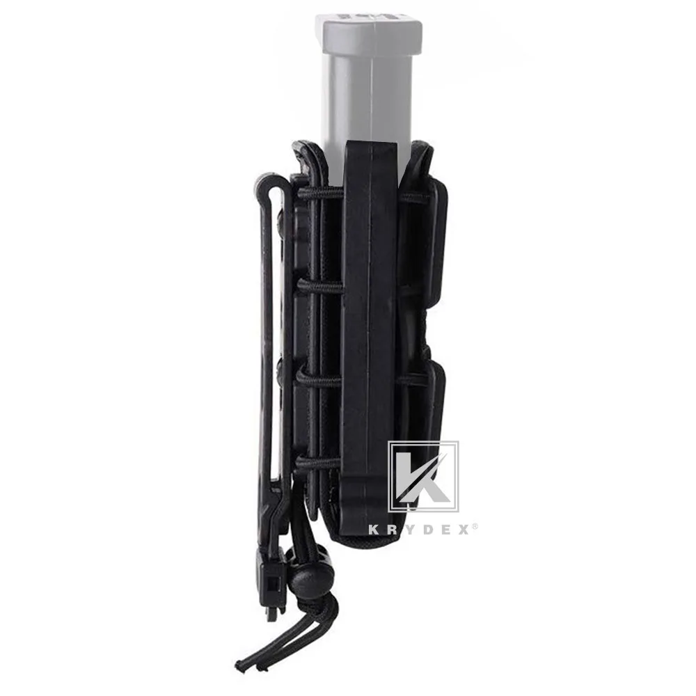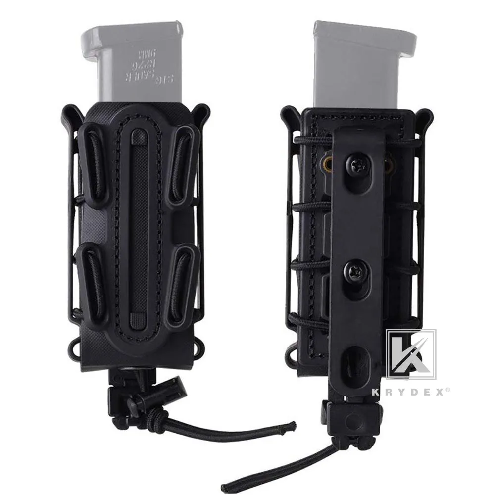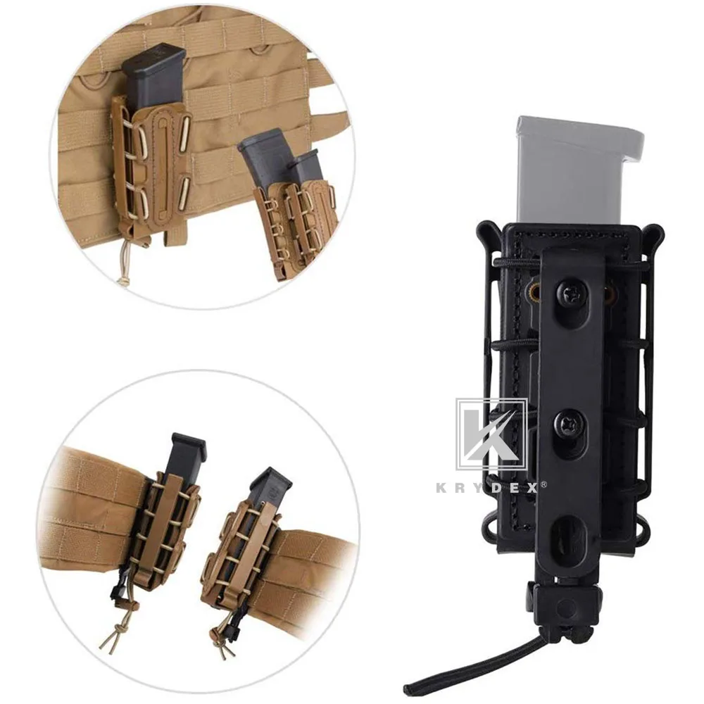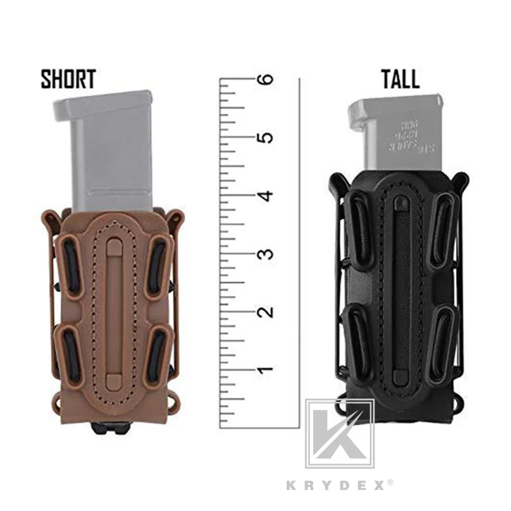 * Material: estructura exterior de exoesqueleto de nailon súper resistente, carcasa blanda moldeada y cordones duraderos, secado rápido, resistente al calor y no es fácil de doblar o deformar, no ganará peso cuando se exponga al agua.* Las superficies acampanadas en los cuatro lados de la apertura de la bolsa permiten una inserción suave y ciega del MAG en la bolsa.* Las bolsas tácticas con Molle Clip se pueden colgar en el equipo con módulo Molle, chaleco táctico, mochila, cinturón.* Hay dos tamaños para bolsas de pistola de carcasa blanda, altas y cortas. Ambos tamaños se ajustan a los cargadores de pila simple y doble.* Este es alto, el tamaño del detalle: L: 2,35 pulgadas W: 0,83 pulgadas, H: 3,93 pulgadas; Peso: 0.26lb.* No importa su preferencia de transporte o aplicación táctica, las bolsas Krydex Softshell son configurables para satisfacer sus necesidades de misión. Puede usarlo para sostener revistas de pistola en airsoft, caza, militar, entrenamiento militar, paintball, juegos de tiro, otros tipos de deportes.* Color: negro, tierra oscura, color oliva.Contenido del paquete* KRYDEX Soft Shell 9mm Pistol Magazine Pouch Tall * 1NOTA:El Modelo de la revista en la imagen NO está incluido. Solo para fines de imagen